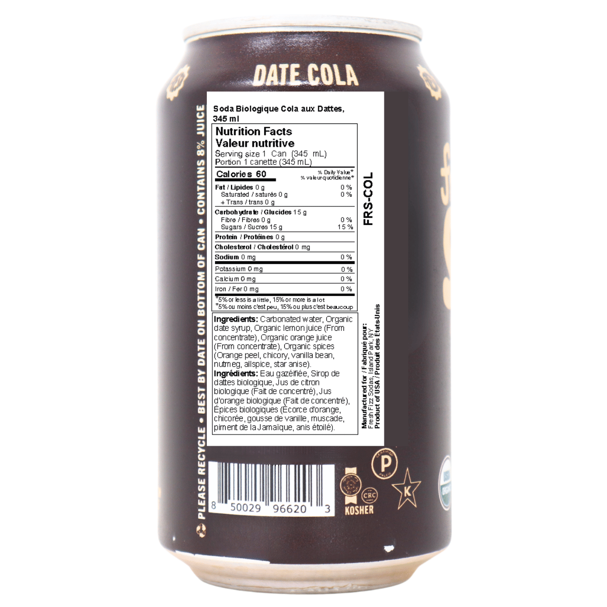 Carbonated water, Organic date syrup, Organic lemon juice (From concentrate), Organic orange juice (From concentrate), Organic spices (Orange peel, chicory, vanilla bean, nutmeg, allspice, star anise).