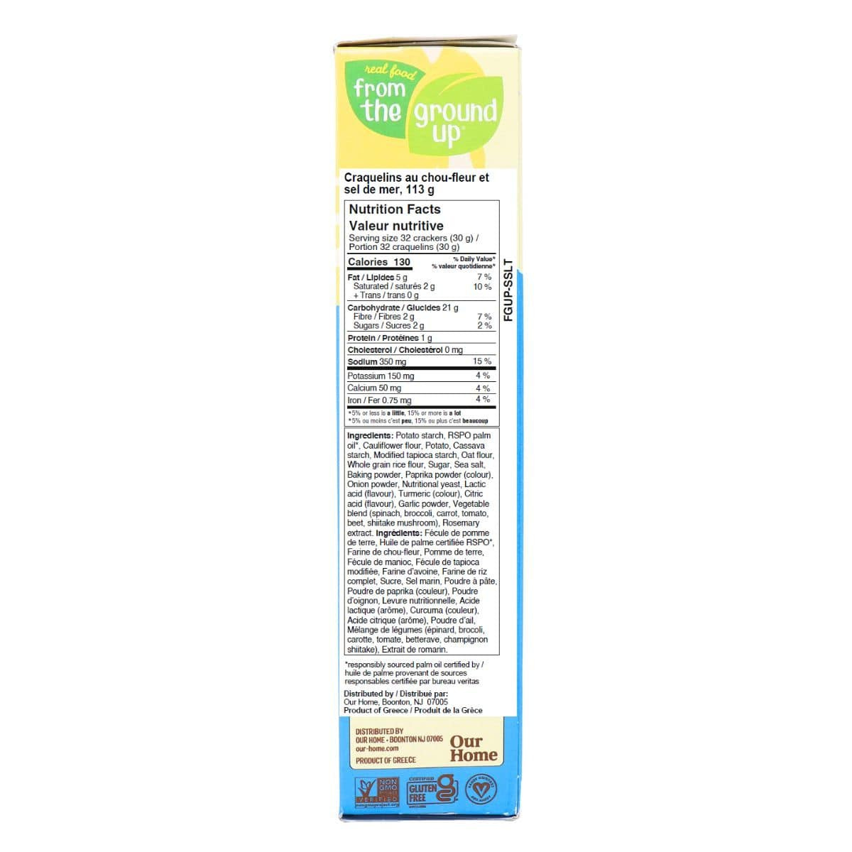 From The Ground Up is rooted in the belief that food should offer equal parts taste and nutrition. Our mission is to create balanced snacks for everyone to enjoy. We bring you familiar shapes and flavors of comfort products, but with a better-for-you twist! How do we make better-for-you taste delicious? Its easy, really. We gather the right mix of veggies and other clean ingredients to give you a guilt-free snack. Our Sea Salt Cauliflower Crackers are non-GMO, gluten-free, plant based and contains a good source of vitamins from veggies.