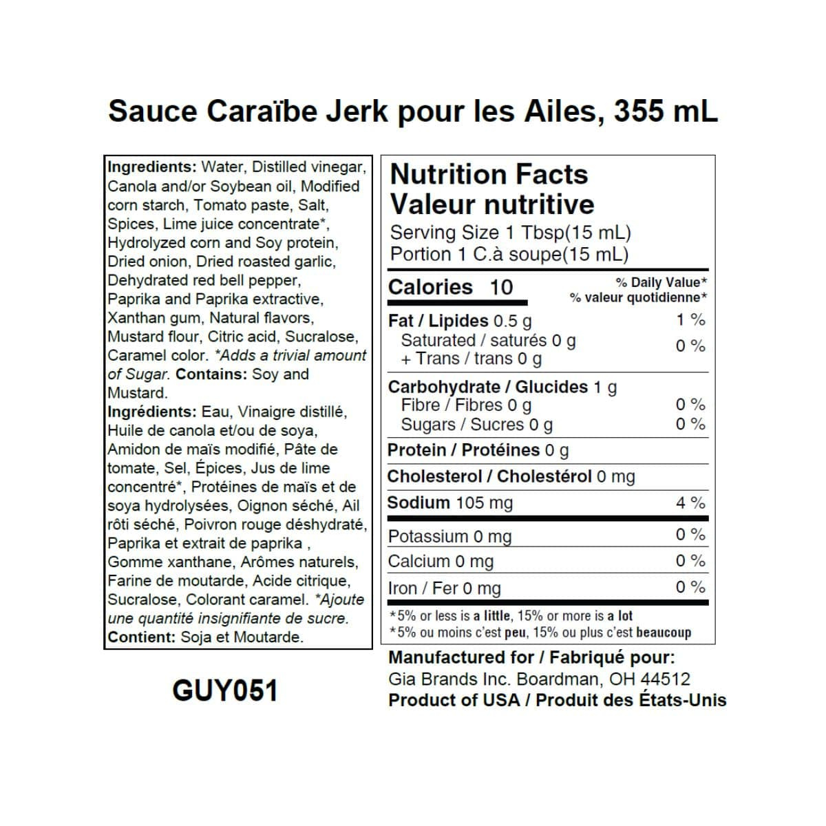 Water, Distilled Vinegar, Canola and/or Soybean Oil, Modified Corn Starch, Tomato Paste, Salt, Spices, Lime Juice Concentrate*, Hydrolyzed Corn And Soy Protein, Dried Onion, Dried Roasted Garlic, Dehydrated Red Bell Pepper, Paprika And Paprika Extractive, Xanthan Gum, Natural Flavors, Mustard Flour, Citric Acid, Sucralose, Caramel Color.