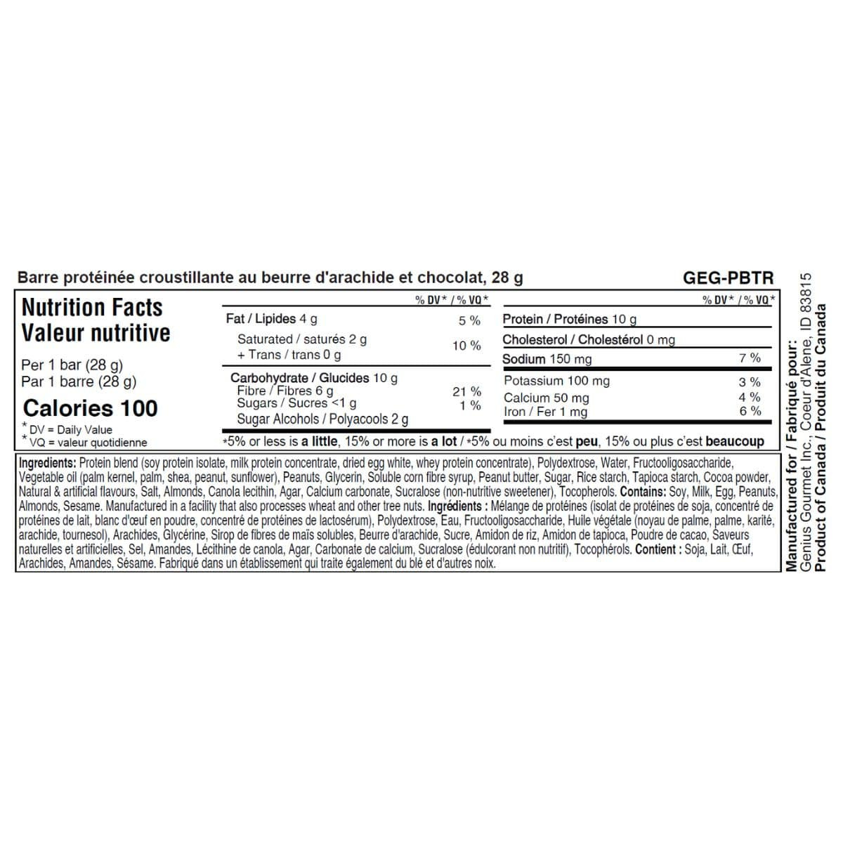 Protein Blend (Soy Protein Isolate, Milk Protein Concentrate, Dried Egg White, Whey Protein Concentrate), Polydextrose, Water, Fructooligosaccharide, Vegetable Oil (Palm Kernel, Palm, Shea, Peanut, Sunflower), Peanuts, Glycerin, Soluble Corn Fibre Syrup, Peanut Butter, Sugar, Rice Starch, Tapioca Starch, Cocoa Powder, Natural & Artificial Flavours, Salt, Almonds, Canola Lecithin, Agar, Calcium Carbonate, Sucralose (Non-Nutritive Sweetener), Tocopherols