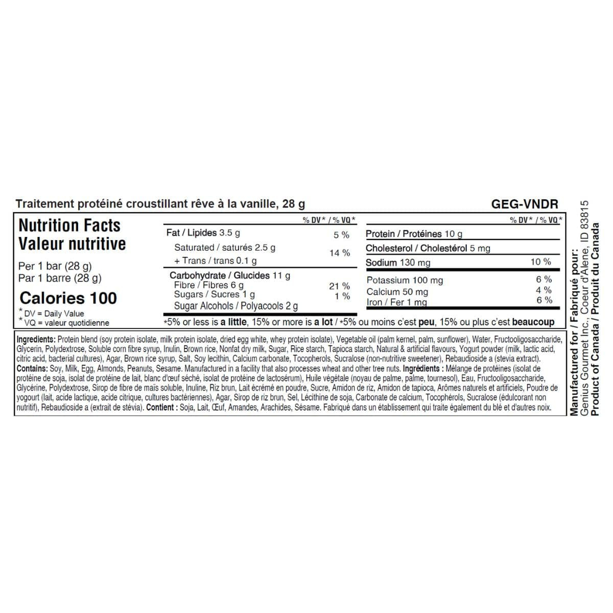 Here’s a protein bar that dreams are made of! Say goodbye to boring snacks and hello to Genius Gourmet Crispy Protein Treat - Vanilla Dream. This delicious crispy treat packs a punch with 10g protein and under 110 calories. No guilt, complete taste. With less than 2g sugar, it’s the ultimate sidekick for your fitness journey.