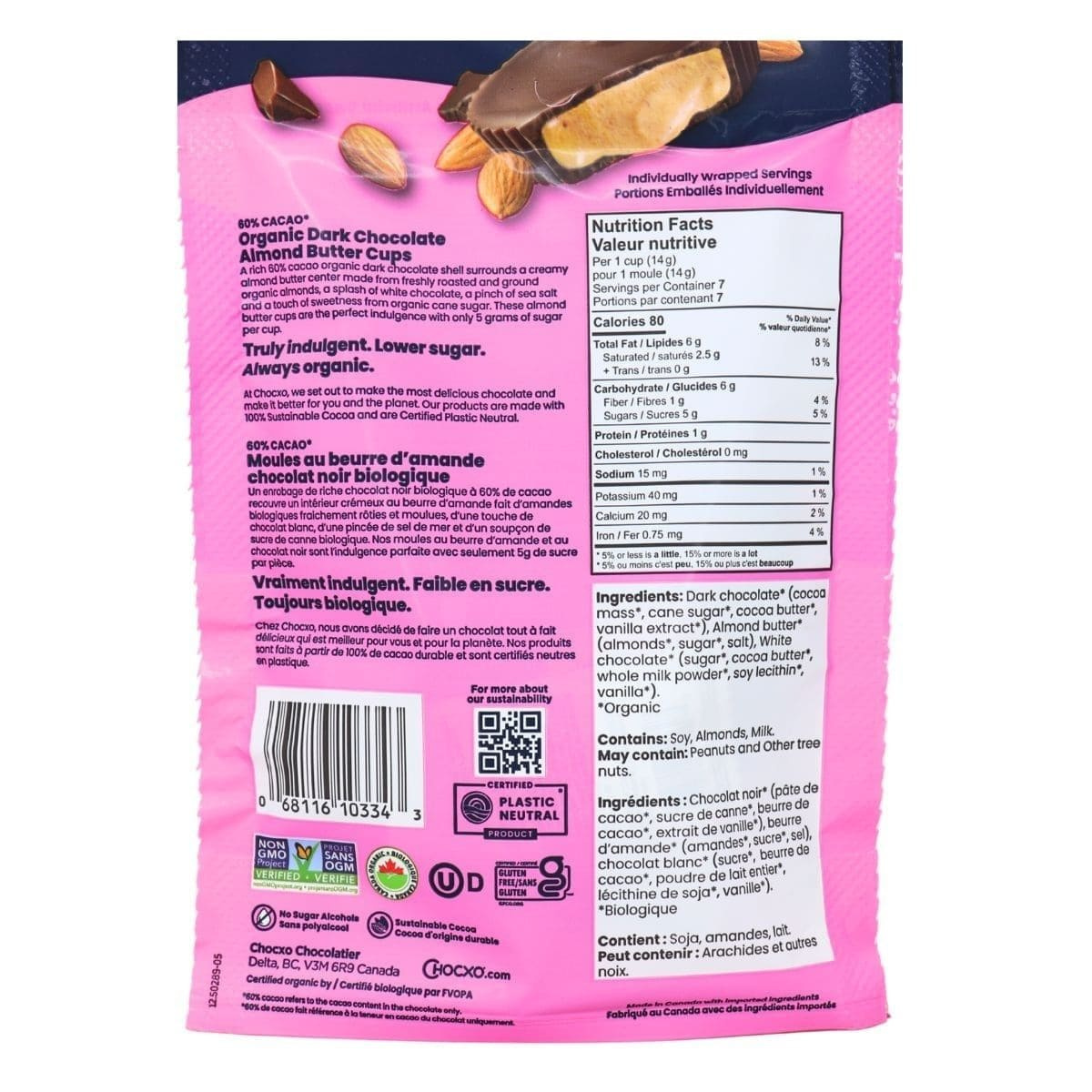 ChocXO 60% Dark Chocolate Almond Butter Cups, 98g - Organic dark chocolate (organic cocoa mass, organic cane sugar, organic cocoa butter, organic vanilla extract), organic almond butter (organic almonds, organic sugar, salt), Organic white chocolate (organic sugar, organic cocoa butter, organic whole milk powder, organic soy lecithin, organic vanilla).