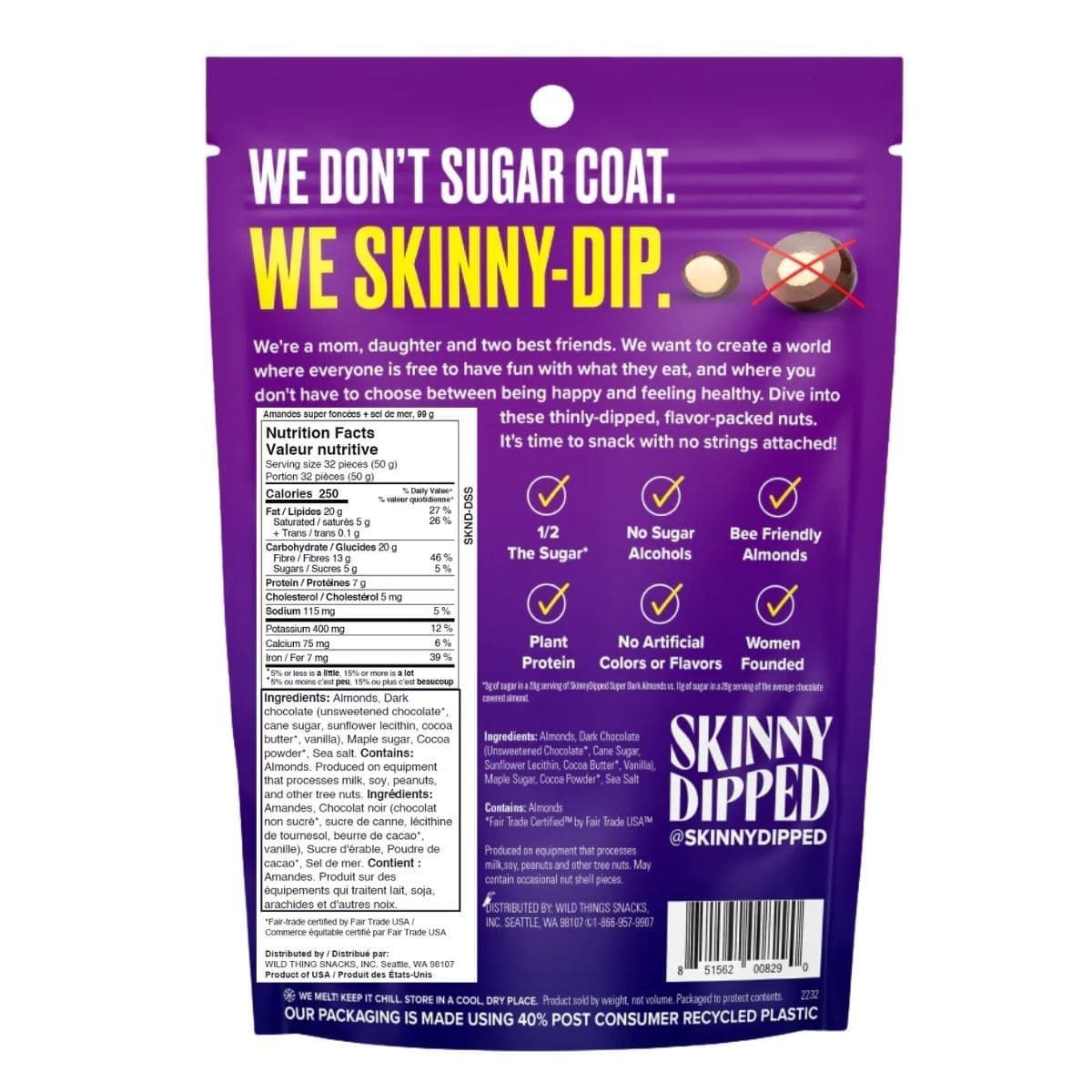 Skinny Dipped Almonds Super Dark + Sea Salt, 99g - Almonds, Dark Chocolate (Unsweetened Chocolate*, Cane Sugar, Sunflower Lecithin, Cocoa Butter*, Vanilla), Maple Sugar, Cocoa Powder*, Sea Salt
