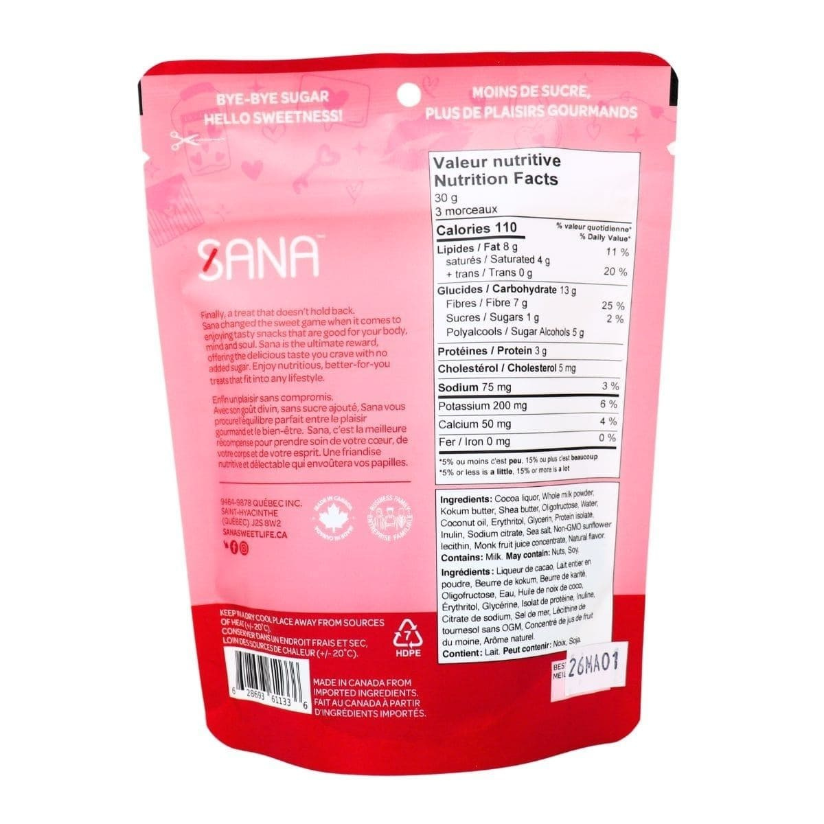 Sana Sweet Life No Added Sugar Chocolatey Hearts Caramel, 100g - Cocoa liquor, Whole milk powder, Kokum butter, Shea butter, oligofructose, Water, Coconut oil, Erythritol, Glycerin, Protein isolate, Inulin, Sodium citrate, Sea salt, Non-GMO sunflower lecithin, Monk fruit juice concentrate, Natural flavour