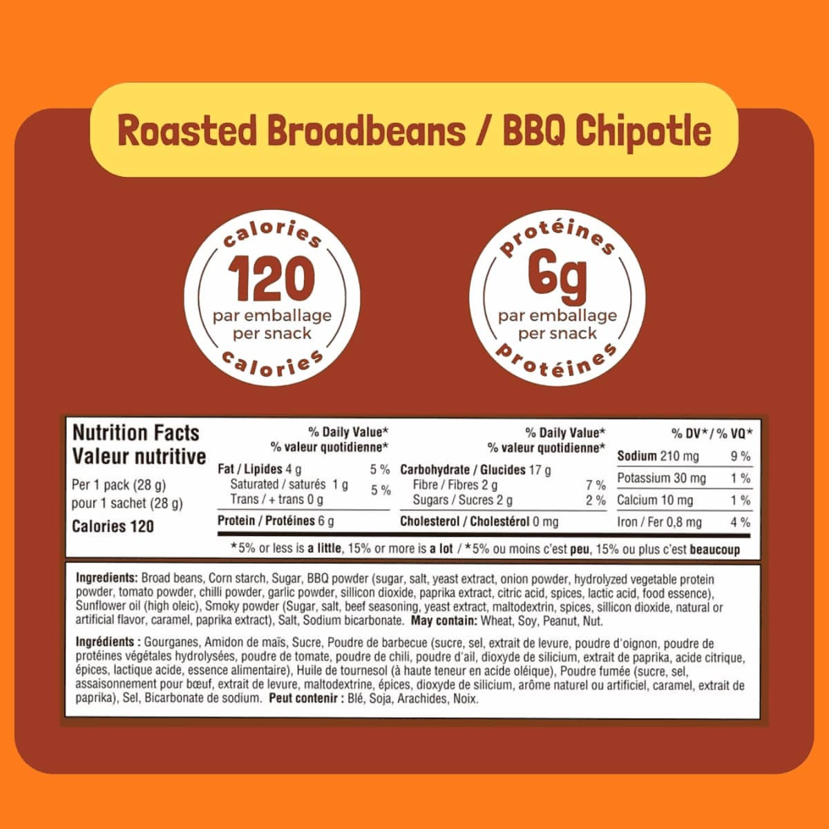 Go! Beanz High Protein Roasted Broadbeans Snack BBQ Chipotle, 28g- Broad Beans (Fava Beans), Corn Starch, Sugar, Sunflower Oil (High Oleic), BBQ Powder (Sugar, Salt, Yeast Extract, Onion Powder, Hydrolyzed Vegetable Protein Powder, Tomato Powder, Chilli Powder, Garlic Powder, Silicon Dioxide, Paprika Extract, Citric Acid, Spices, Lactic Acid, Natural Flavour), Smoky Powder (Sugar, Salt, Beef Seasoning, Yeast Extract, Maltodextrin, Spices, Silicon Dioxide, Natural Flavour, Caramel, Paprika Extract), Salt, Sodium Bicarbonate May Contain: Wheat, Soy, Peanut, Nut
