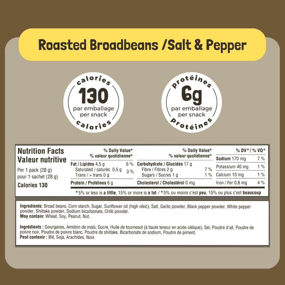 Go! Beanz High Protein Roasted Broadbeans Snack Salt & Pepper, 28g- Broad Beans (Fava Beans), Corn Starch, Sugar, Sunflower Oil (High Oleic), Salt, Garlic Powder, Black Pepper Powder, White Pepper Powder, Shiitake Powder, Sodium Bicarbonate, Chilli Powder May Contain: Wheat, Soy, Peanut, Nut