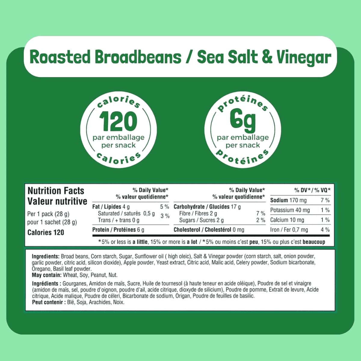Go! Beanz High Protein Roasted Broadbeans Snack Sea Salt & Vinegar, 28g- Broad Beans (Fava Beans), Corn Starch, Sugar, Sunflower Oil (High Oleic), Salt & Vinegar Powder (Corn Starch, Salt, Onion Powder, Garlic Powder, Citric Acid, Silicon Dioxide), Apple Powder, Yeast Extract, Citric Acid, Malic Acid, Celery Powder, Sodium Bicarbonate, Oregano, Basil Leaf Powder May Contain: Wheat, Soy, Peanut, Nut