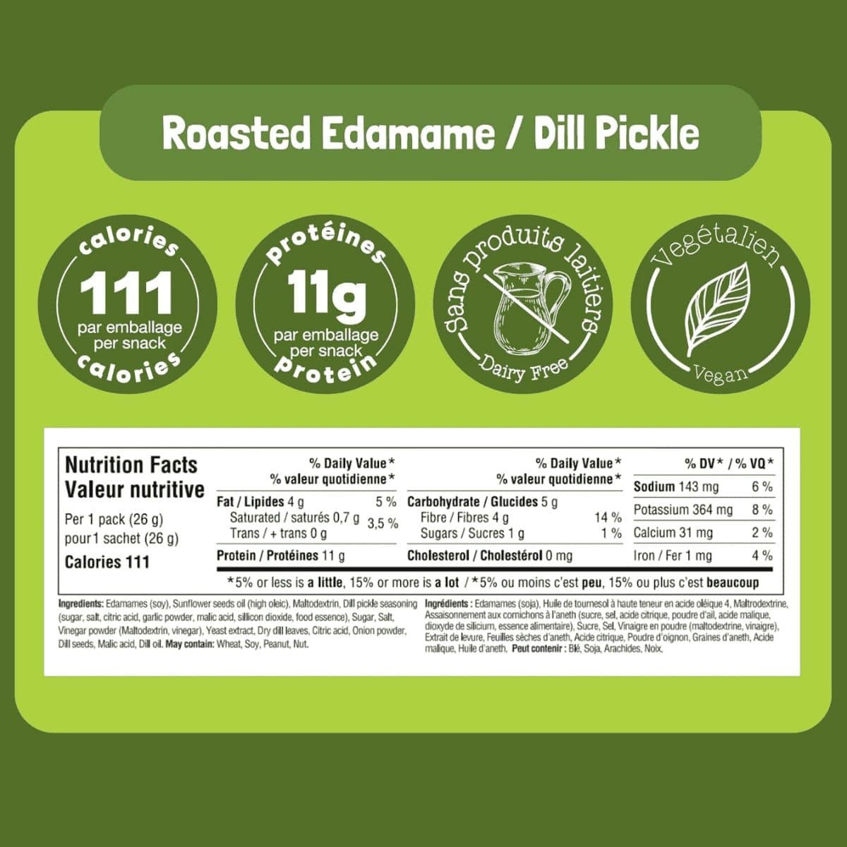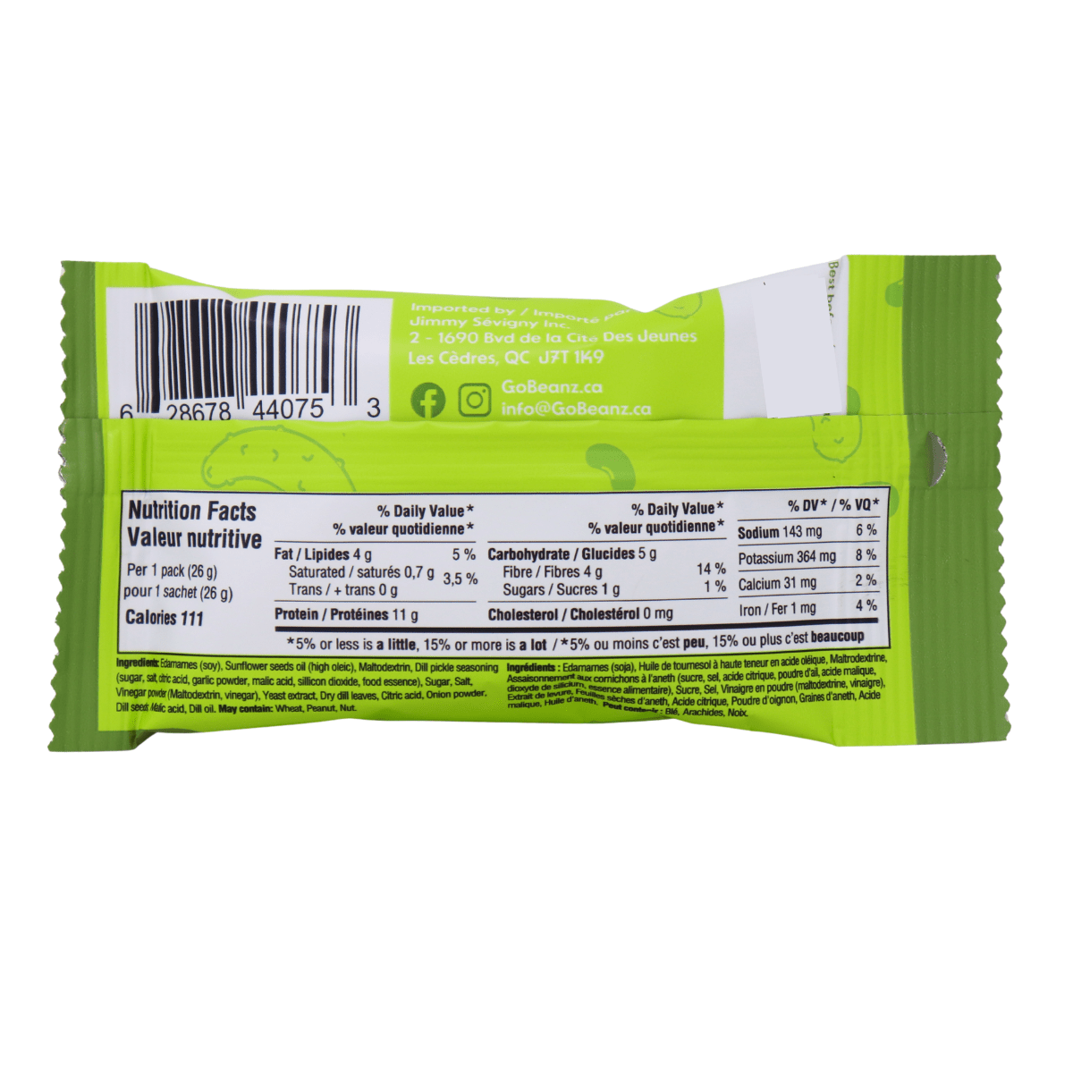Go! Beanz High Protein Roasted Edamame Beans Snack Dill Pickle, 26g - Edamames (Soy), Sunflower Seeds Oil (High Oleic), Maltodextrin, Dill Pickle Seasoning (Sugar, Salt, Citric Acid, Garlic Powder, Malic Acid, Silicon Dioxide, Food Essence), Sugar, Salt, Vinegar Powder (Maltodextrin, Vinegar), Yeast Extract, Dry Dill Leaves, Citric Acid, Onion Powder, Dill Seeds, Malic Acid, Dill Oil