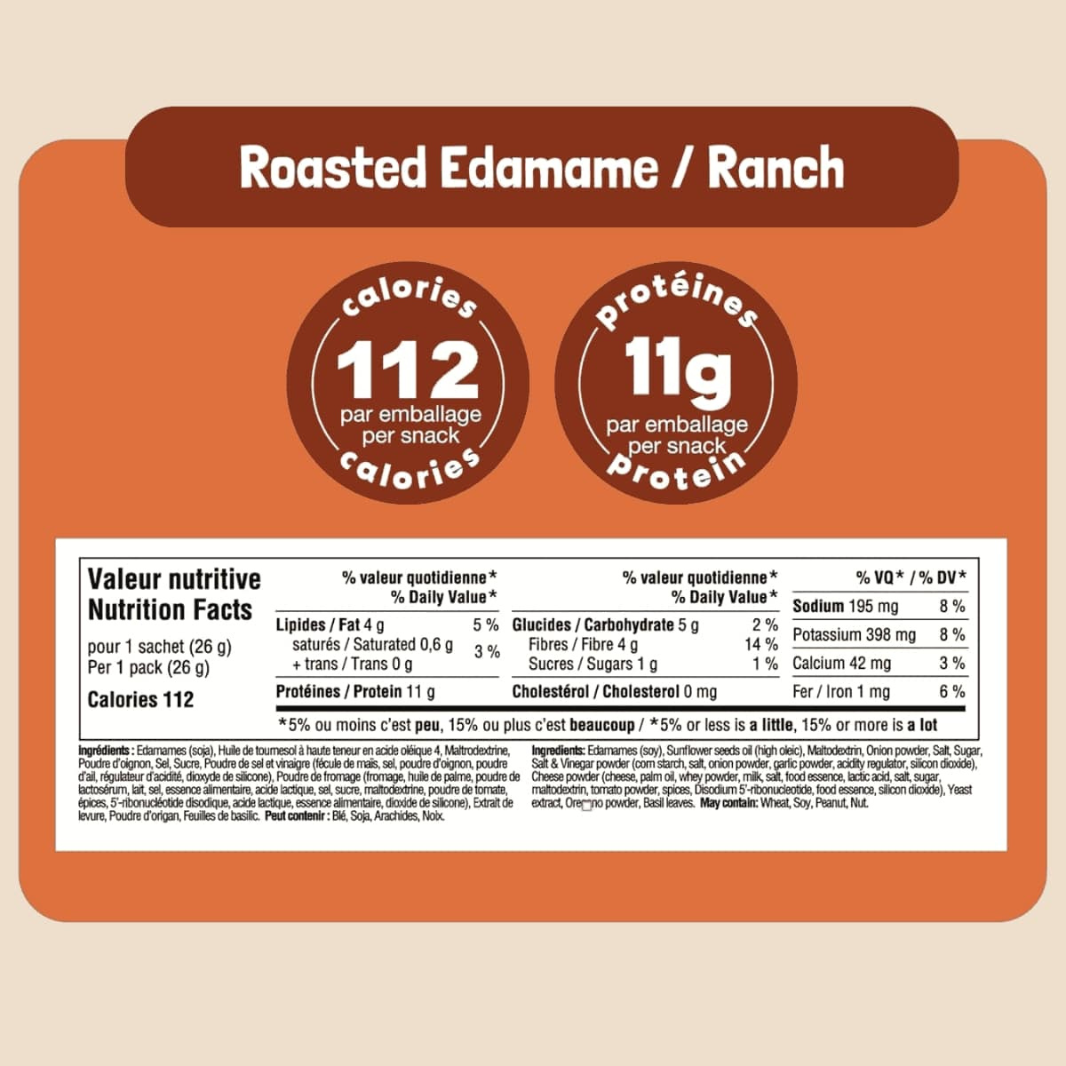 Go! Beanz High Protein Roasted Edamame Beans Snack Ranch, 26g- Edamames (Soy), Sunflower Seeds Oil (High Oleic), Maltodextrin, Onion Powder, Salt, Sugar, Salt & Vinegar Powder (Corn Starch, Salt, Onion Powder, Garlic Powder, Citric Acid, Silicon Dioxide), Cheese Powder (Cheese, Palm Oil, Whey Powder, Milk, Salt, Sugar, Maltodextrin, Tomato Powder, Spices, Disodium 5’-Ribonucleotide, Lactic Acid, Food Essence, Silicon Dioxide), Yeast Extract, Oregano Powder, Basil Leaves May Contain: Wheat, Peanut, Nut, Milk