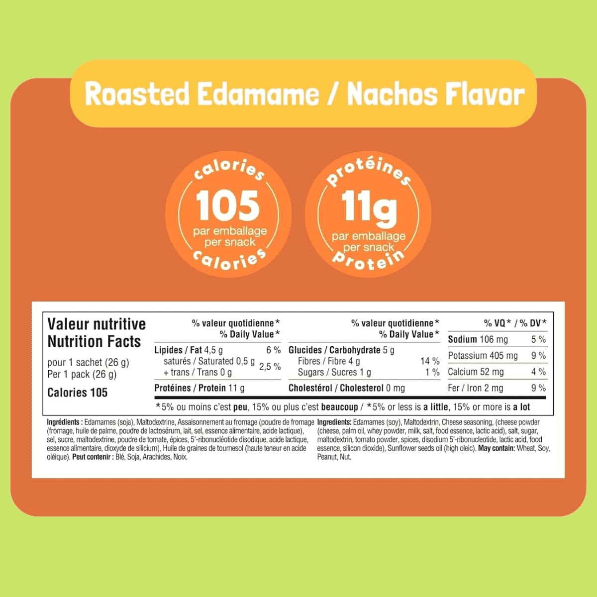 Go! Beanz High Protein Roasted Edamame Beans Snack Nachos, 26g- Edamames (Soy), Maltodextrin, Cheese Seasoning [Cheese Powder (Cheese, Palm Oil, Whey Powder, Milk, Salt, Food Essence, Lactic Acid), Salt, Sugar, Maltodextrin, Tomato Powder, Spices, Disodium 5’-Ribonucleotide, Lactic Acid, Food Essence, Silicon Dioxide], Sunflower Seeds Oil (High Oleic) May Contain: Wheat, Soy, Peanut, Nut