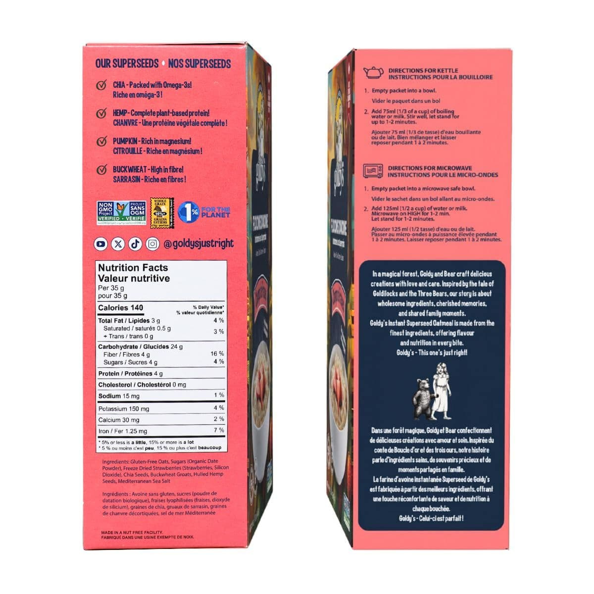 Goldilocks will want to sneak a few bites of this! Goldys' instant superseed oatmeal is bursting with real freeze-dried strawberries and crunchy superseeds like hemp seeds, pumpkin seeds, and chia seeds, for a comforting bite that's just right! Made with Canadian glyphosate-free oats and naturally sweetened with organic date powder, Goldys' strawberry oatmeal is packed with 4g of protein and 4g of fibre, making it a berry-licious way to start your day. Just add hot water, stir and enjoy the perfect balance of sweet, crunchy and satisfying in every bite!