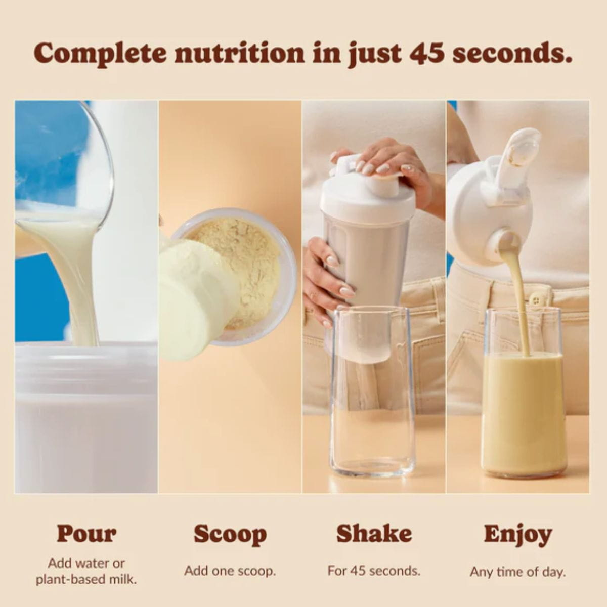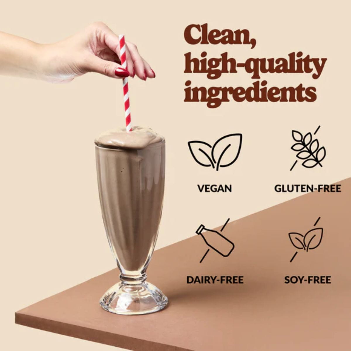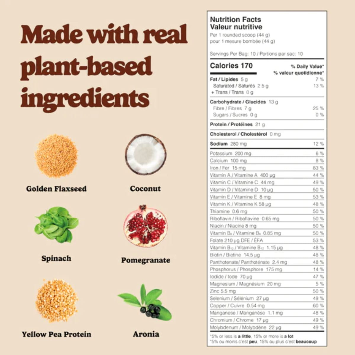 Protein blend (pea protein, milled golden flaxseed), Natural flavours, Soluble tapioca fibers, Coconut milk powder* (coconut milk powder*, tapioca maltodextrin*, acacia gum*), Alkalyzed cocoa powder, Acacia gum, Guar gum, Xanthan gum, Medium chain triglycerides (medium chain triglycerides from coconut oil, acacia gum), Fruits, Vegetables and mushrooms blend (broccoli, spinach, kale, pumpkin, sweet potato, sunflower seed, cranberry, chlorella, maitake mushroom, shiitake mushroom, pomegranate juice power*, acai juice powder*, goji juice powder*, grape juice powder*, amla fruit powder*, aronia powder*, sea buckthorn juice powder*, camu camu powder*, acerola juice powder*), Rebaudioside M, Salt, Bacterial culture and enzymes blend (rice maltodextrin, Bacillus subtilis, amylase, protease).*Organic ingredients