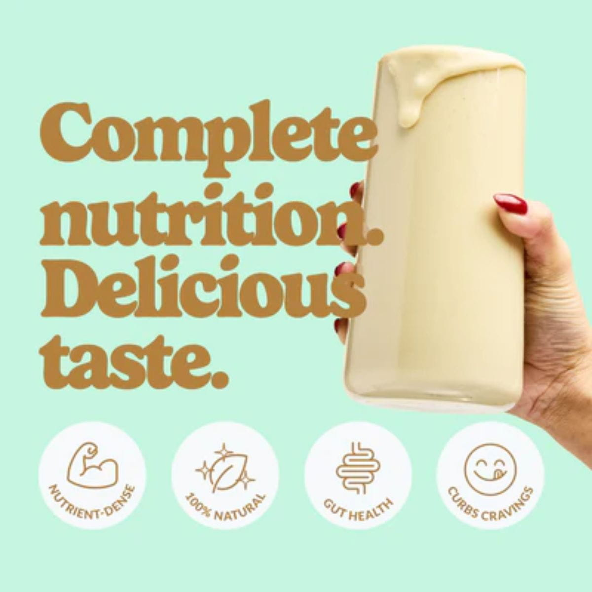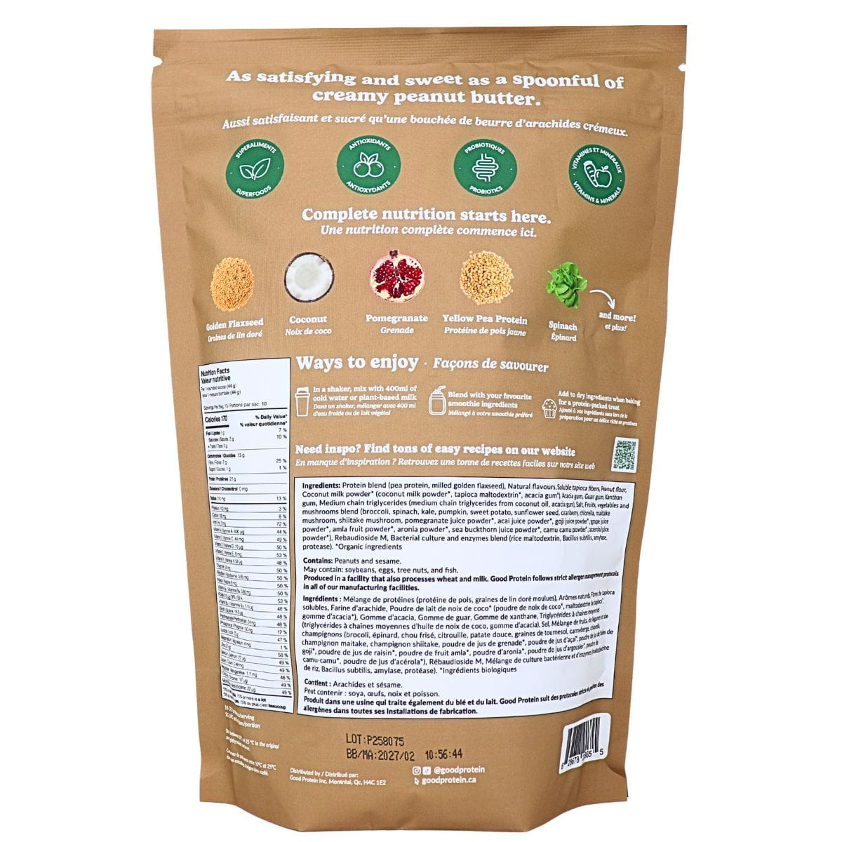 Protein blend (pea protein, milled golden flaxseed), Natural flavours, Soluble tapioca fibers, Peanut flour, Coconut milk powder* (coconut milk powder*, tapioca maltodextrin*, acacia gum*), Acacia gum, Guar gum, Xanthan gum, Medium chain triglycerides (medium chain triglycerides from coconut oil, acacia gum), Salt, Fruits, Vegetables and mushrooms blend (broccoli, spinach, kale, pumpkin, sweet potato, sunflower seed, cranberry, chlorella, maitake mushroom, shiitake mushroom, pomegranate juice powder*, acai juice powder*, goji juice powder*, grape juice powder*, amla fruit powder*, aronia powder*, sea buckthorn juice powder*, camu camu powder*, acerola juice powder*), Rebaudioside M, Bacterial culture and enzymes blend (rice maltodextrin, Bacillus subtilis, amylase, protease). *Organic ingredients