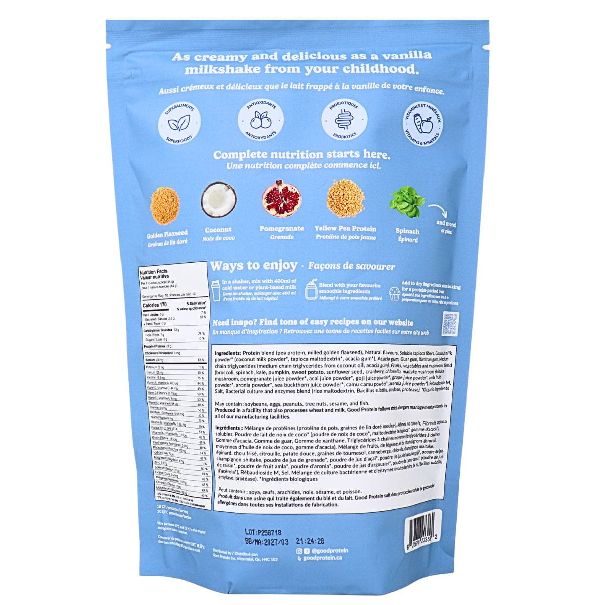 Think vanilla is boring? Well, Good Protein’s all-in-one shake is here to shake things up! With organic superfoods, vitamins and minerals, real fruit and veggies, and gut-healthy probiotics, this superfood protein powder is anything but boring! Rich and creamy, every sip of Good Protein’s vanilla milkshake tastes just like your childhood. But with 21g of plant-based protein and 7g of fibre, this vanilla protein powder does it all–—curbs your sweet tooth, fuels your day, and keeps you going. It’s classic, it’s creamy, it’s everything good in one shake. The perfect mix of good for you and (almost) too good to be true…that’s the power of Good Protein.