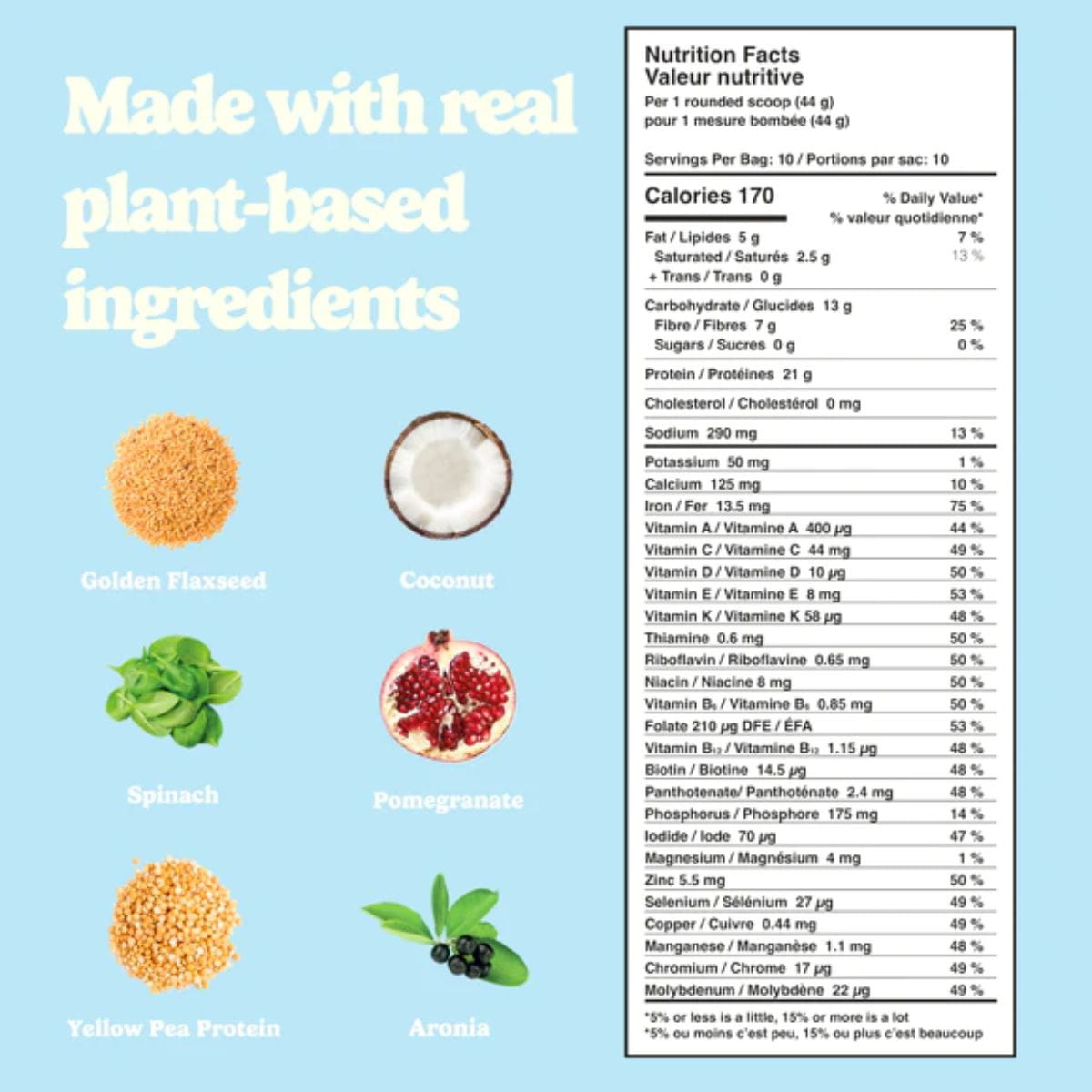 Protein blend (pea protein, milled golden flaxseed), Natural flavours, Soluble tapioca fibers, Coconut milk powder* (coconut milk powder*, tapioca maltodextrin*, acacia gum*), Acacia gum, Guar gum, Xanthan gum, Medium chain triglycerides (medium chain triglycerides from coconut oil, acacia gum), Fruits, Vegetables and mushrooms blend (broccoli, spinach, kale, pumpkin, sweet potato, sunflower seed, cranberry, chlorella, maitake mushroom, shiitake mushroom, pomegranate juice powder*, acai juice powder*, goji juice powder*, grape juice powder*, amla fruit powder*, aronia powder*, sea buckthorn juice powder*, camu camu powder*, acerola juice powder*), Rebaudioside M, Salt, Bacterial culture and enzymes blend (rice maltodextrin, Bacillus subtilis, amylase, protease). *Organic ingredients.