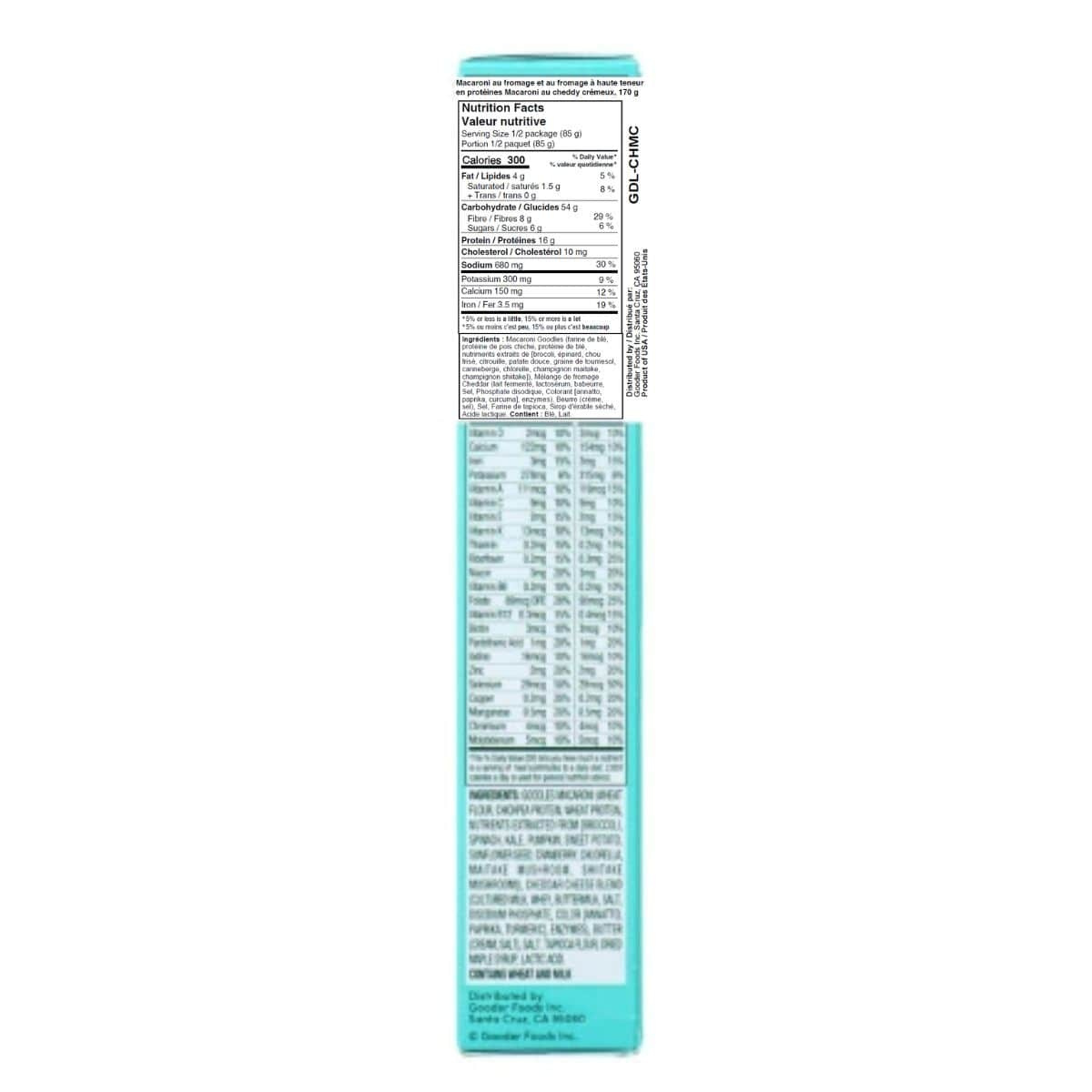 Goodles macaroni (wheat flour, chickpea protein, wheat protein, nutrients extracted from [broccoli, spinach, kale, pumpkin, sweet potato, sunflower seed, cranberry, chlorella, maitake mushroom, shiitake mushroom]), Cheddar cheese blend (cultured milk, whey, buttermilk, salt, disodium phosphate, colour [annatto, paprika, turmeric], enzymes), Butter (cream, salt), Salt, Tapioca flour, Dried maple syrup, Lactic acid