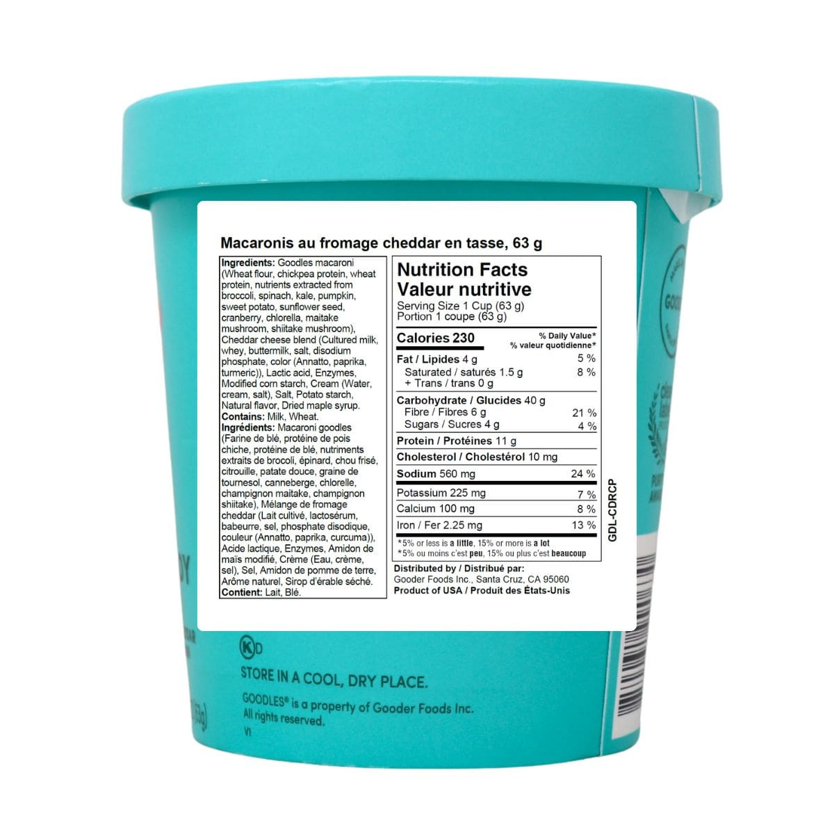Goodles macaroni (Wheat flour, chickpea protein, wheat protein, nutrients extracted from broccoli, spinach, kale, pumpkin, sweet potato, sunflower seed, cranberry, chlorella, maitake mushroom, shiitake mushroom), Cheddar cheese blend (Cultured milk, whey, buttermilk, salt, disodium phosphate, color (Annatto, paprika, turmeric)), Lactic acid, Enzymes, Modified corn starch, Cream (Water, cream, salt), Salt, Potato starch, Natural flavor, Dried maple syrup.