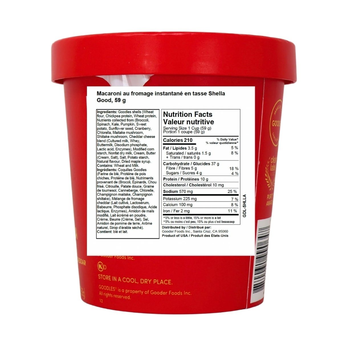 Meet your new favourite quick comfort food. Goodles Instant Mac & Cheese Cup Shella Good takes the iconic creamy cheddar mac you love and boosts it with a punch of nutrition, including added protein, prebiotics, and nutrients from veggies like broccoli, spinach, kale, and sweet potato.