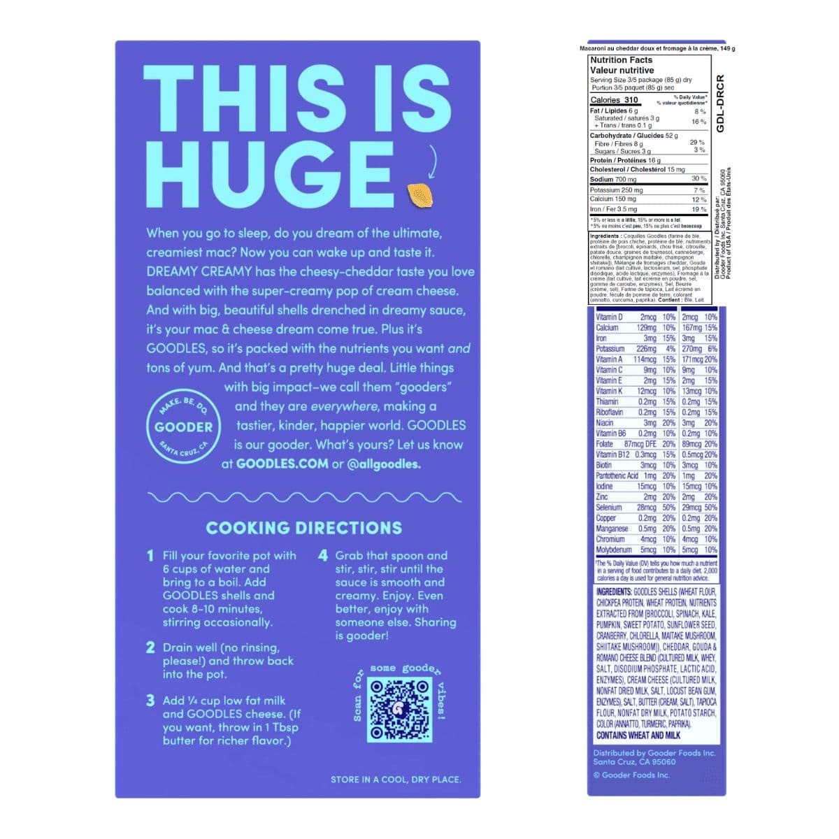 Goodles Shells (Wheat Flour, Chickpea Protein, Wheat Protein, Nutrients Extracted From [Broccoli, Spinach, Kale, Pumpkin, Sweet Potato, Sunflower Seed, Cranberry, Chlorella, Maitake Mushroom, Shiitake Mushroom]), Cheddar, Gouda & Romano Cheese Blend (Cultured Milk, Whey, Salt, Disodium Phosphate, Lactic Acid, Enzymes), Cream Cheese (Cultured Milk, Nonfat Dried Milk, Salt, Locust Bean Gum, Enzymes), Salt, Butter (Cream, Salt), Tapioca Flour, Nonfat Dry Milk, Potato Starch, Colour (Annatto, Turmeric, Paprika)