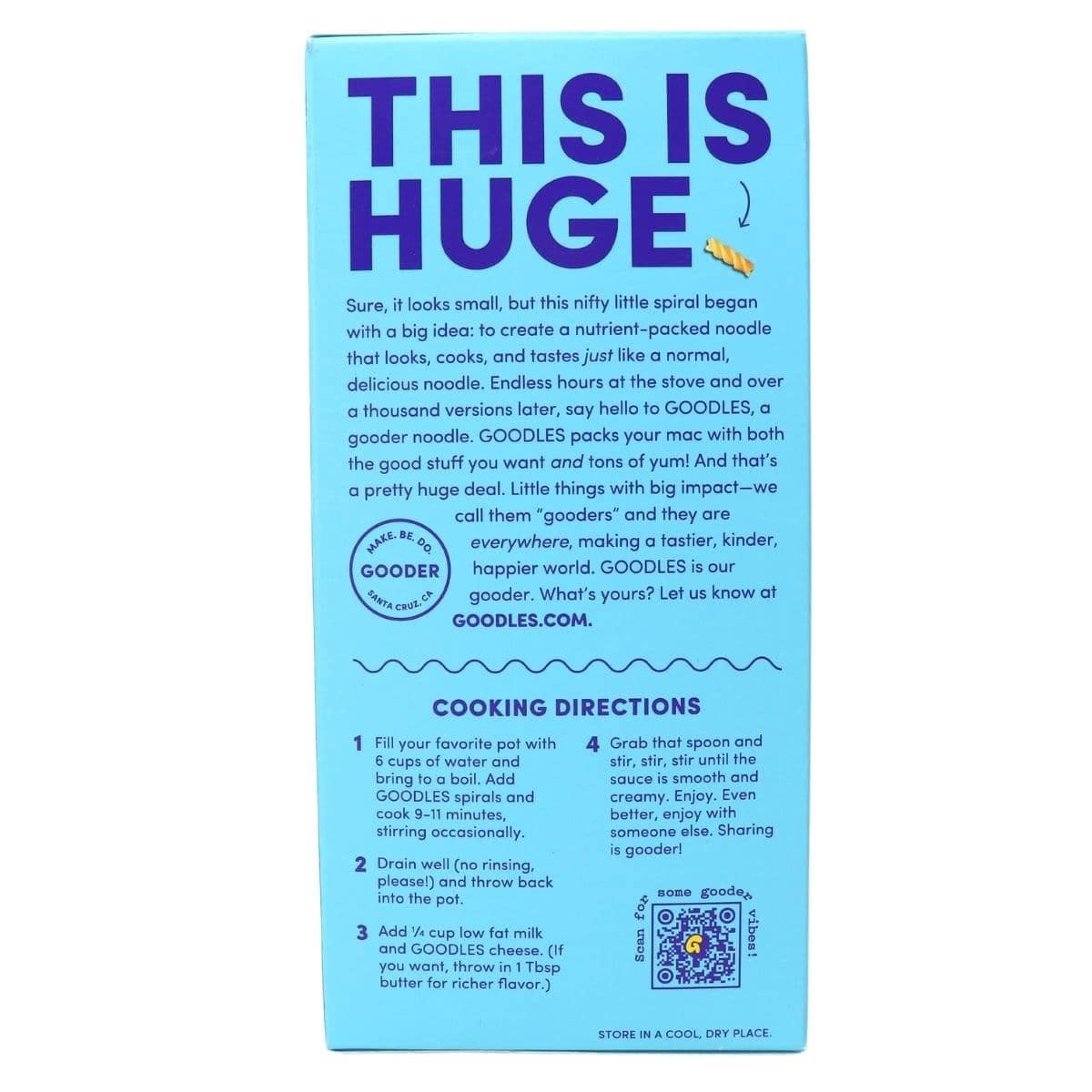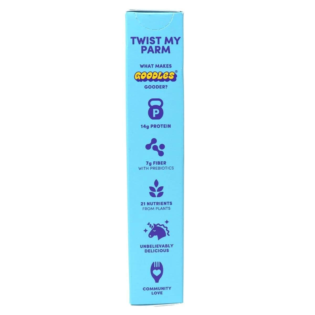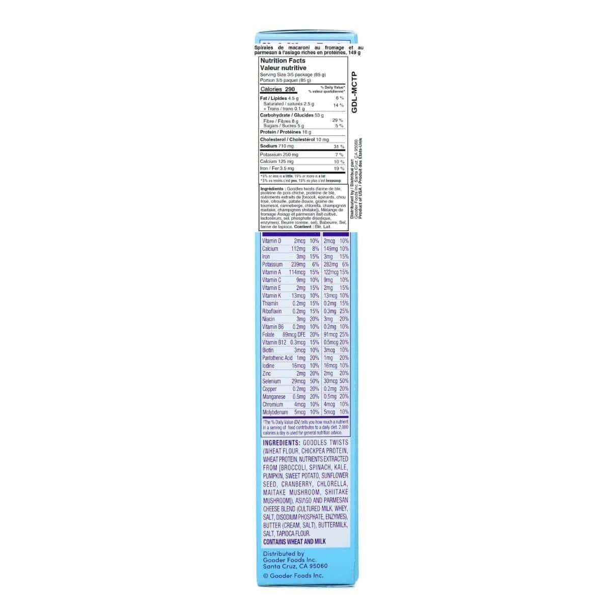 Goodles Protein Mac and Cheese Asiago Parmesan Twist My Parm 4 Pack, 149g-Â Goodles twists (wheat flour, chickpea protein, wheat protein, nutrients extracted from [broccoli, spinach, kale, pumpkin, sweet potato, sunflower seed, cranberry, chlorella, maitake mushroom, shiitake mushroom]), Asiago and parmesan cheese blend (cultured milk, whey, salt, disodium phosphate, enzymes), Butter (cream, salt), Buttermilk, Salt, Tapioca flour