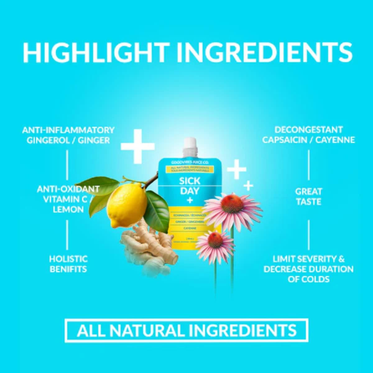 Feeling under the weather? No worries, Sick Day is here to swoop in and save the day! Packed with powerful natural ingredients like lemon, cayenne, and ginger, it’s got everything you need to help combat a pesky cold, this spicy ginger shot is like a superhero for your immune system!