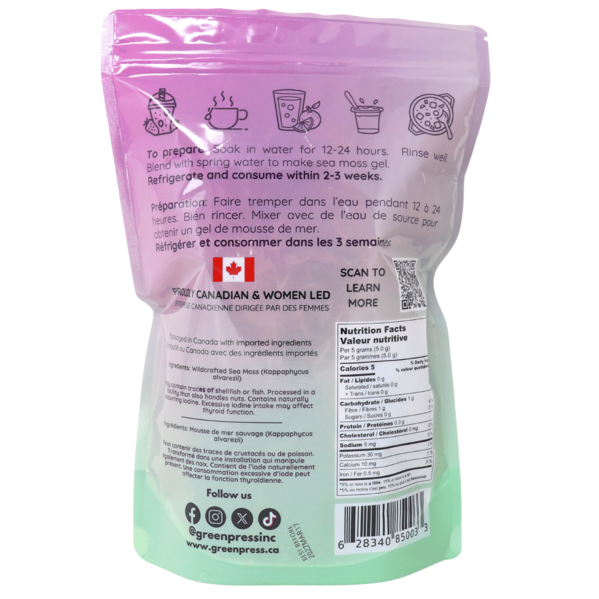 One bag. Every benefit. Green Press Full Spectrum Dried Sea Moss is a natural blend of gold, green, and purple sea moss, all harvested wild from the Caribbean and sun dried for mineral retention. This variety gives you the best of each colour: the smoothness of gold, the cleansing touch of green, and the antioxidant strength of purple. It’s an easy way to enjoy the full range of