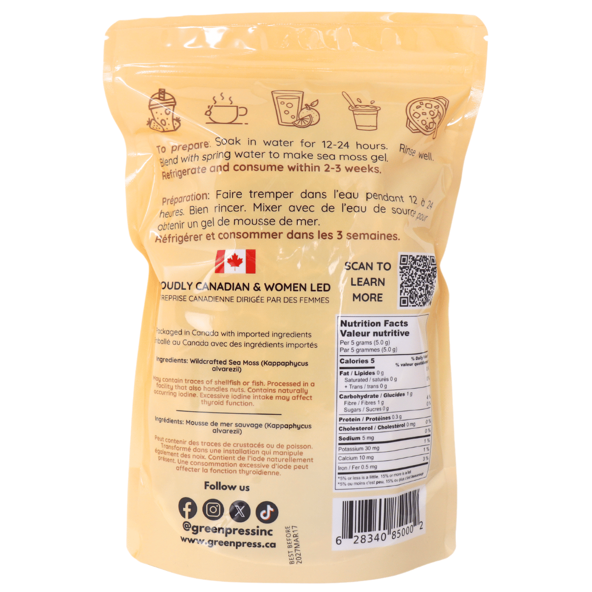Unlike powdered alternatives or processed gels, Green Press sea moss stays close to nature. It’s dried whole, never bleached, and never stripped of its natural nutrients. You soak it at home to rehydrate, then blend it into your favourite smoothies, teas, or soups. Use it in plant-based recipes, or prepare it the traditional way to create your own sea moss gel if desired.
