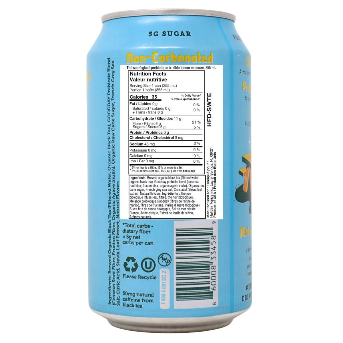 Brewed Organic Black Tea (Filtered Water, Organic Black Tea), GOODDAY Prebiotic Blend (Cassava Root Fiber, Fructan Fiber, Organic Agave Inulin), Organic Raw Cane Sugar, French Grey Sea Salt, Citric Acid, Stevia Leaf Extract, Natural Flavours