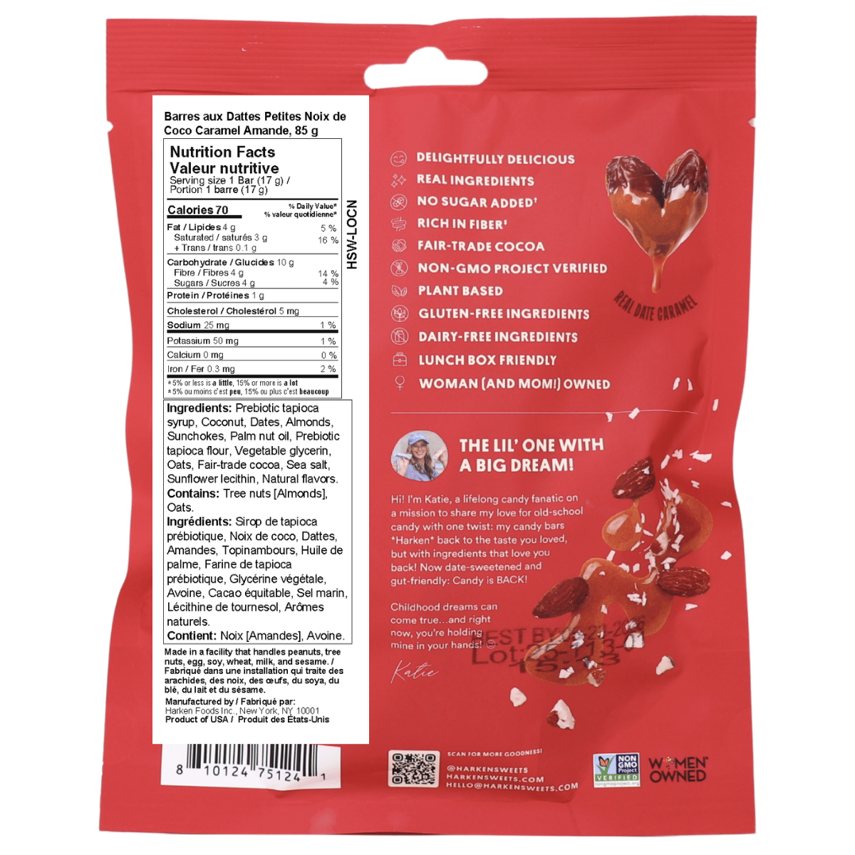 Harken The Lil Coconutty Ones are chewy and rich, with real shredded coconut, roasted almonds, and a touch of date caramel for that nougaty layered chocolate bar texture you need. It’s all wrapped in a smooth, dairy-free chocolate coating that brings it all together in these amazing individually wrapped mini bars.
