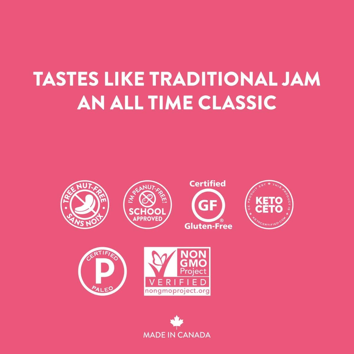 KETO Raspberry Chia Jam. A nice spreadable texture made with real strawberries, our Healthy Crunch Strawberry Jam is the perfect combo of freshness and sweetness, with 50% less sugar than traditional jam with only 2 grams of sugar and 4 grams of fibre per serving. Made fresh in Canada, this delicious spread is Paleo, Ket, Vegan, Gluten-Free, AND Non-GMO Certified! Completely free from peanuts and treenuts, this one is ready for your little ones lunches, to spread on crackers, or when you want that mid-day nostalgic PB & J!