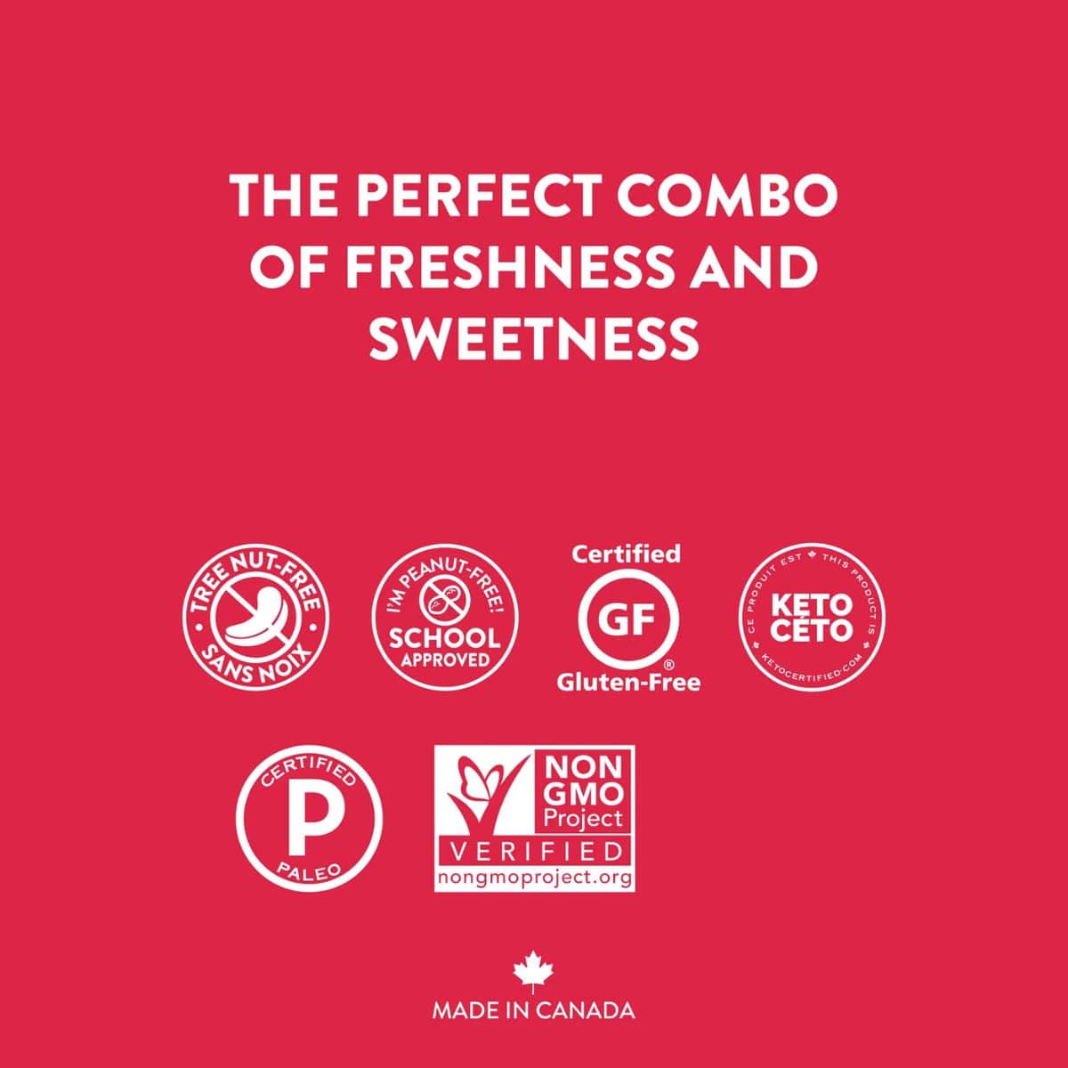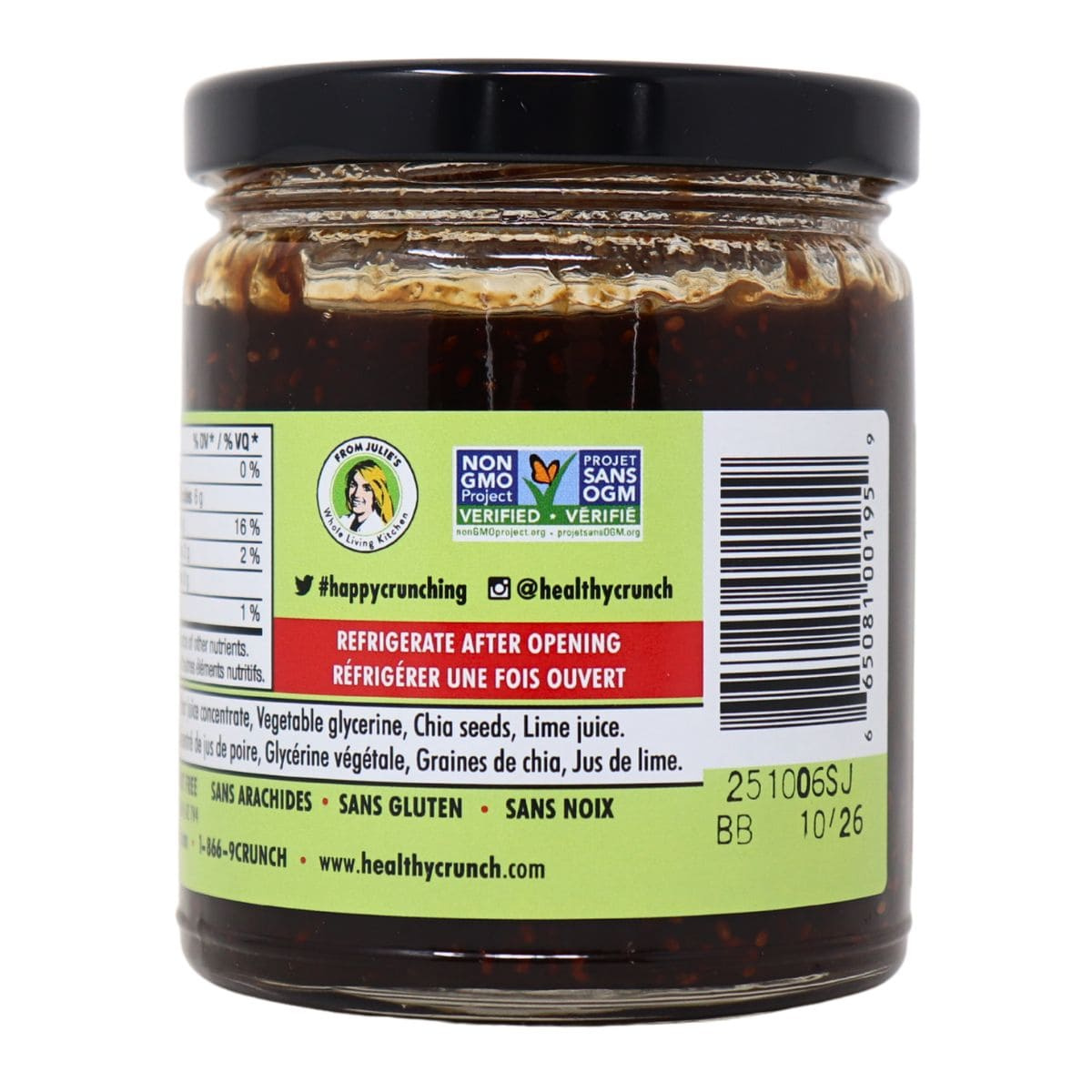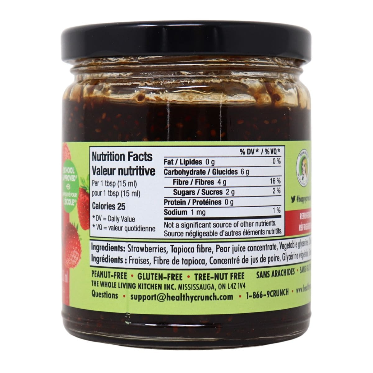KETO Strawberry Chia Jam. A nice spreadable texture made with real strawberries, our Healthy Crunch Strawberry Jam is the perfect combo of freshness and sweetness, with 50% less sugar than traditional jam with only 2 grams of sugar and 4 grams of fibre per serving. Made fresh in Canada, this delicious spread is Paleo, Keto, Vegan, Gluten-Free, AND Non-GMO Certified! Completely free from peanuts and treenuts, this one is ready for your little ones lunches, to spread on crackers, or when you want that mid-day nostalgis PB & J!