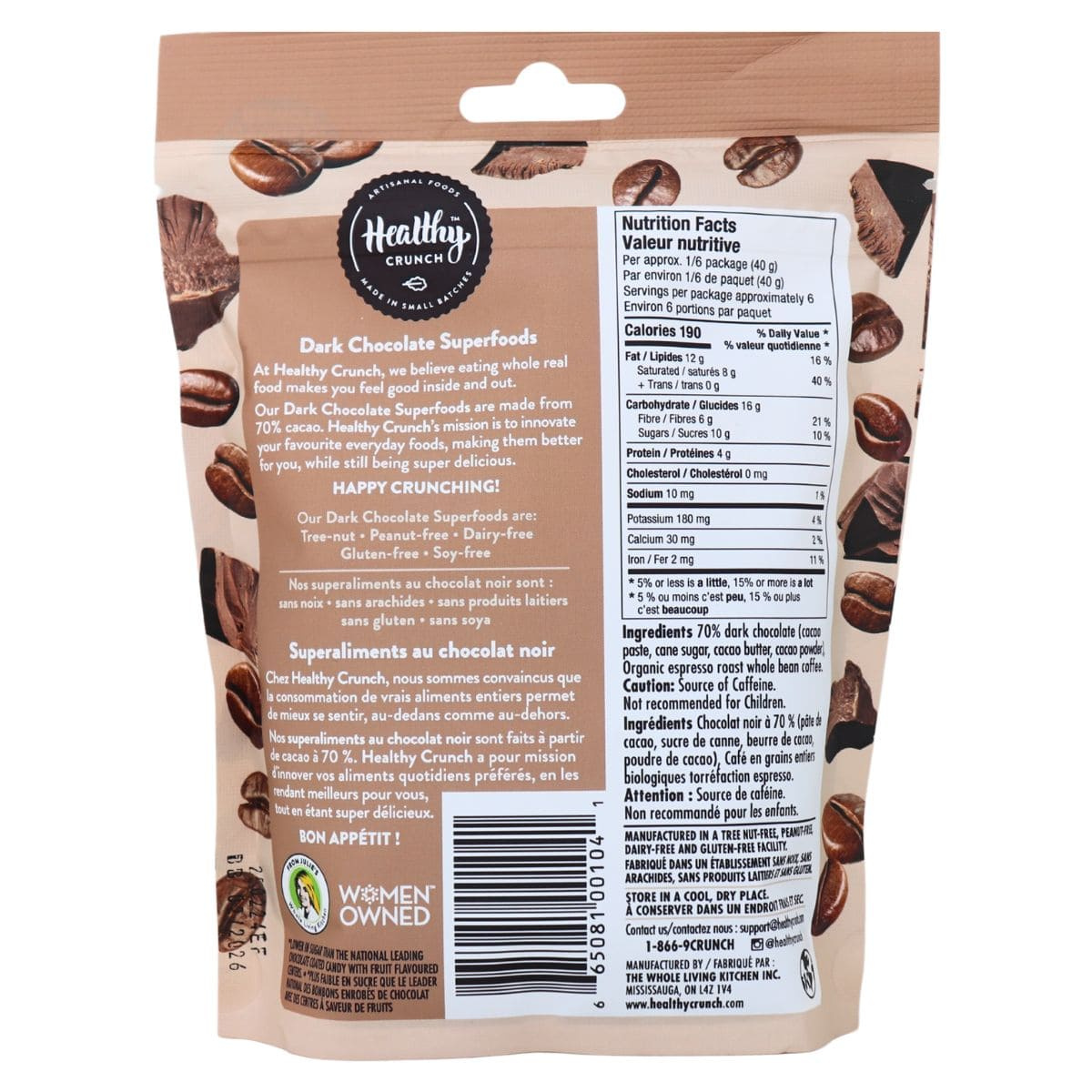 The perfect combination for your refined and sophisticated sweet tooth! Robust organic espresso beans are coated in a decadent dark chocolate layer to create a luxurious blend of delicious flavour. The perfect snack for coffee lovers and chocoholics alike! Plant-based, gluten-free and vegan, Healthy crunch likes to keep it simple–and by simple, we mean simple ingredients! Made with non-GMO ingredients that you can actually pronounce, these chocolate delights are also peanut-free, tree-nut free, dairy-free and soy-free. Low in sugar but high in flavour, you can enjoy these in small bites or in large handfuls!