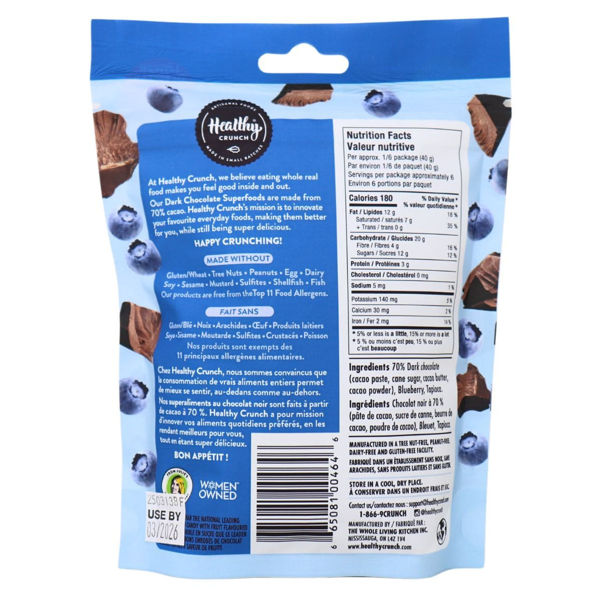 70% Dark Chocolate (Cacao Paste, Cane Sugar, Cacao Butter, Cacao Powder), Blueberry, Tapioca.