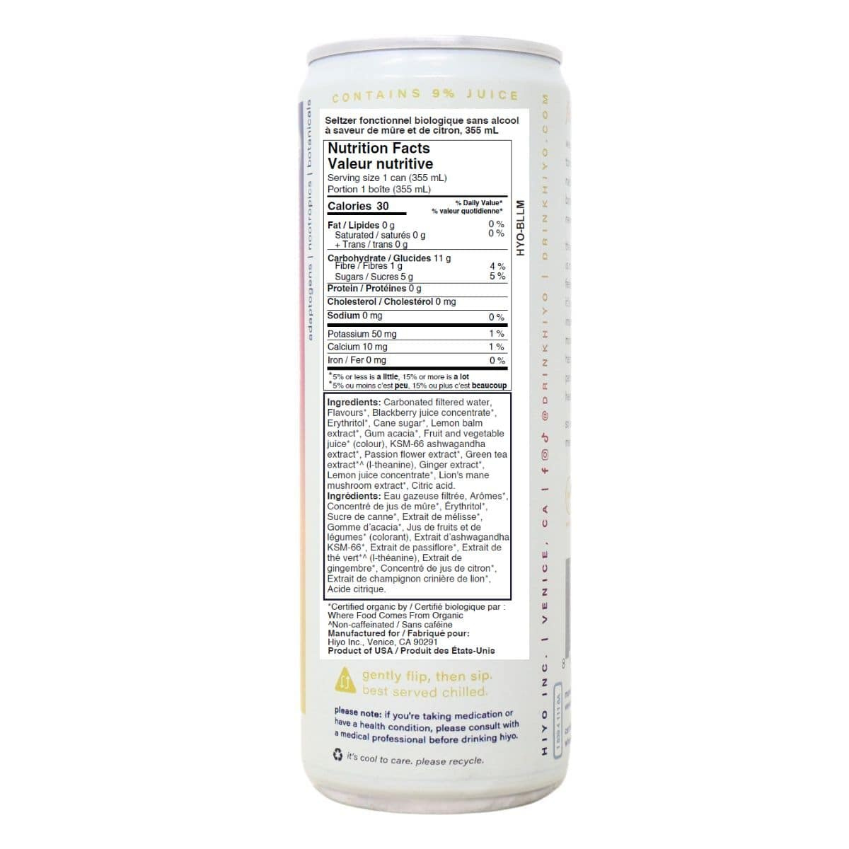 Carbonated Filtered Water, Organic Flavors, Organic Blackberry Juice Concentrate, Organic Erythritol, Organic Cane Sugar, Organic Lemon Balm Extract, Organic Gum Acacia, Organic Fruit And Vegetable Juice (Color), Organic Ksm-66 Ashwagandha Extract, Organic Passion Flower Extract, Organic Green Tea Extract* (L-Theanine), Organic Ginger Extract, Organic Lemon Juice Concentrate, Organic Lion's Mane Mushroom Extract, Citric Acid