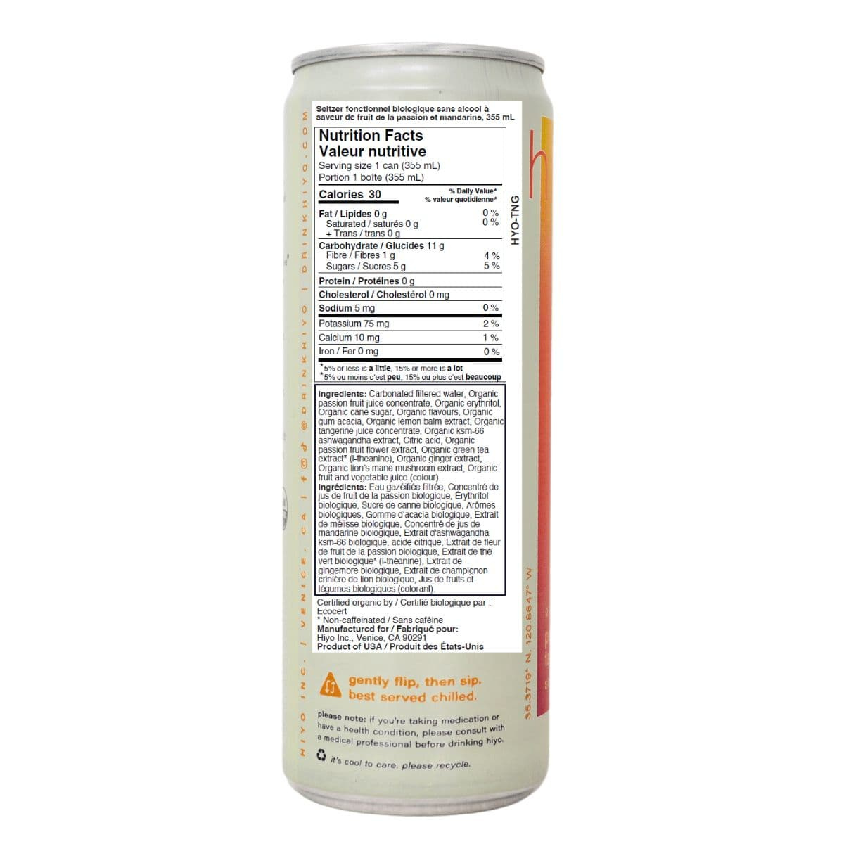 Carbonated Filtered Water, Organic Passion Fruit Juice Concentrate, Organic Erythritol, Organic Cane Sugar, Organic Flavours, Organic Gum Acacia, Organic Lemon Balm Extract, Organic Tangerine Juice Concentrate, Organic Ksm-66 Ashwagandha Extract, Citric Acid, Organic Passion Fruit Flower Extract, Organic Green Tea Extract* (L-Theanine), Organic Ginger Extract, Organic Lionās Mane Mushroom Extract, Organic Fruit And Vegetable Juice (Colour)