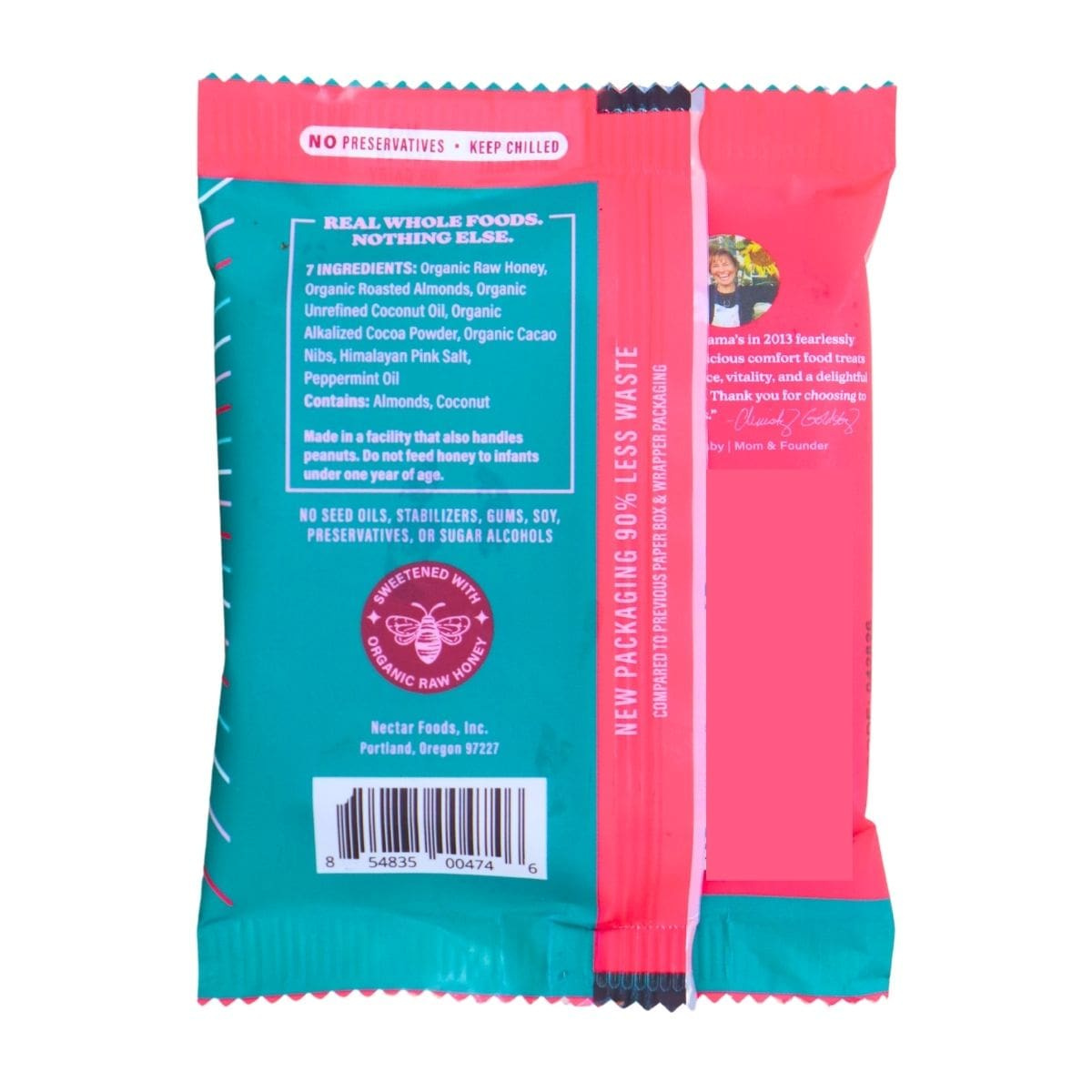 Organic raw honey, Organic roasted almonds, Organic unrefined coconut oil, Organic alkalized cocoa powder, Organic cacao nibs, Himalayan pink salt, Peppermint oil.