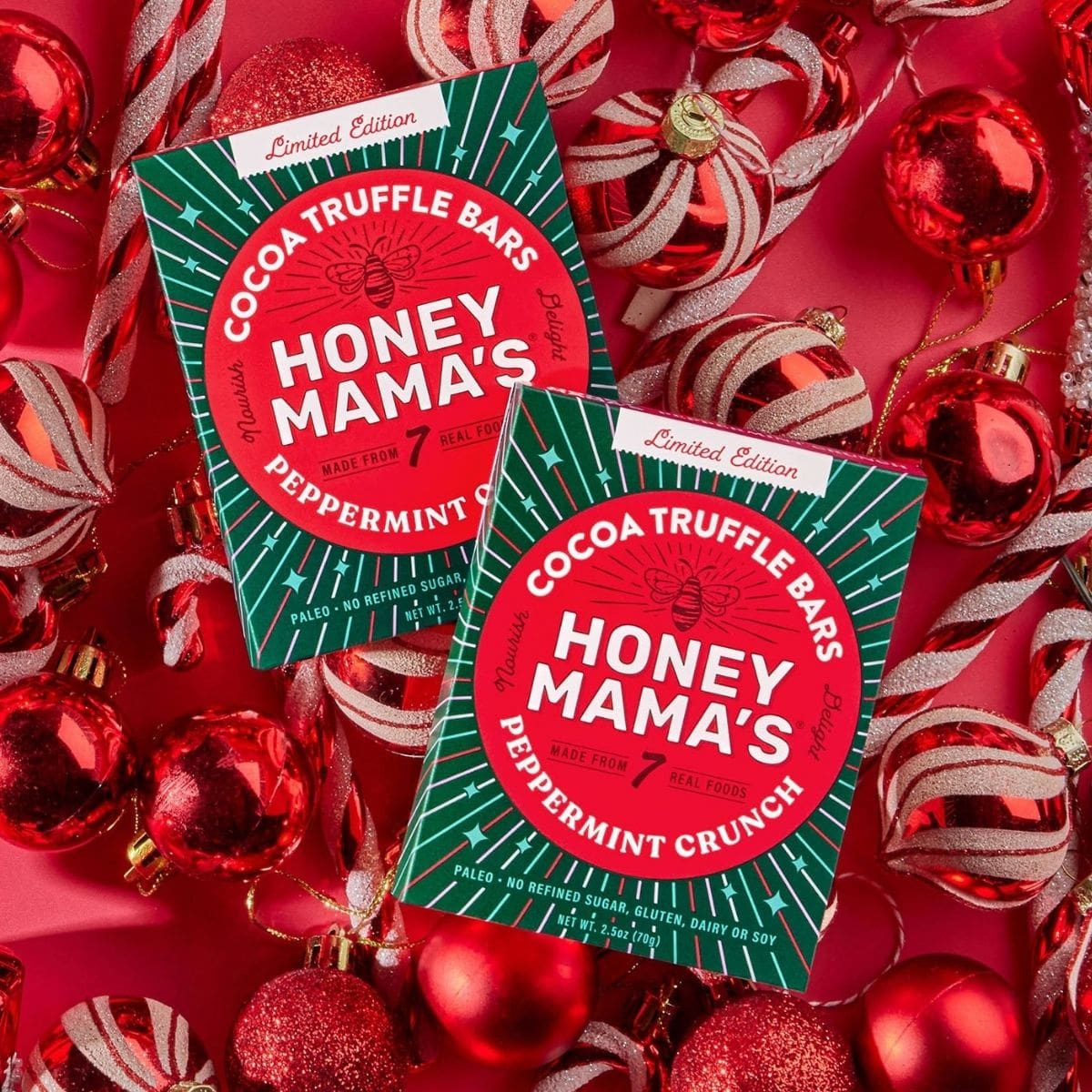 Rich cocoa and cool peppermint come together in this luscious, honey-sweetened truffle bar that tastes as festive as it looks. Honey Mama’s Peppermint Crunch Cocoa Truffle Bar is handcrafted with organic honey, cocoa, and coconut for a soft, creamy bite with a gentle mint finish and light, natural crunch.