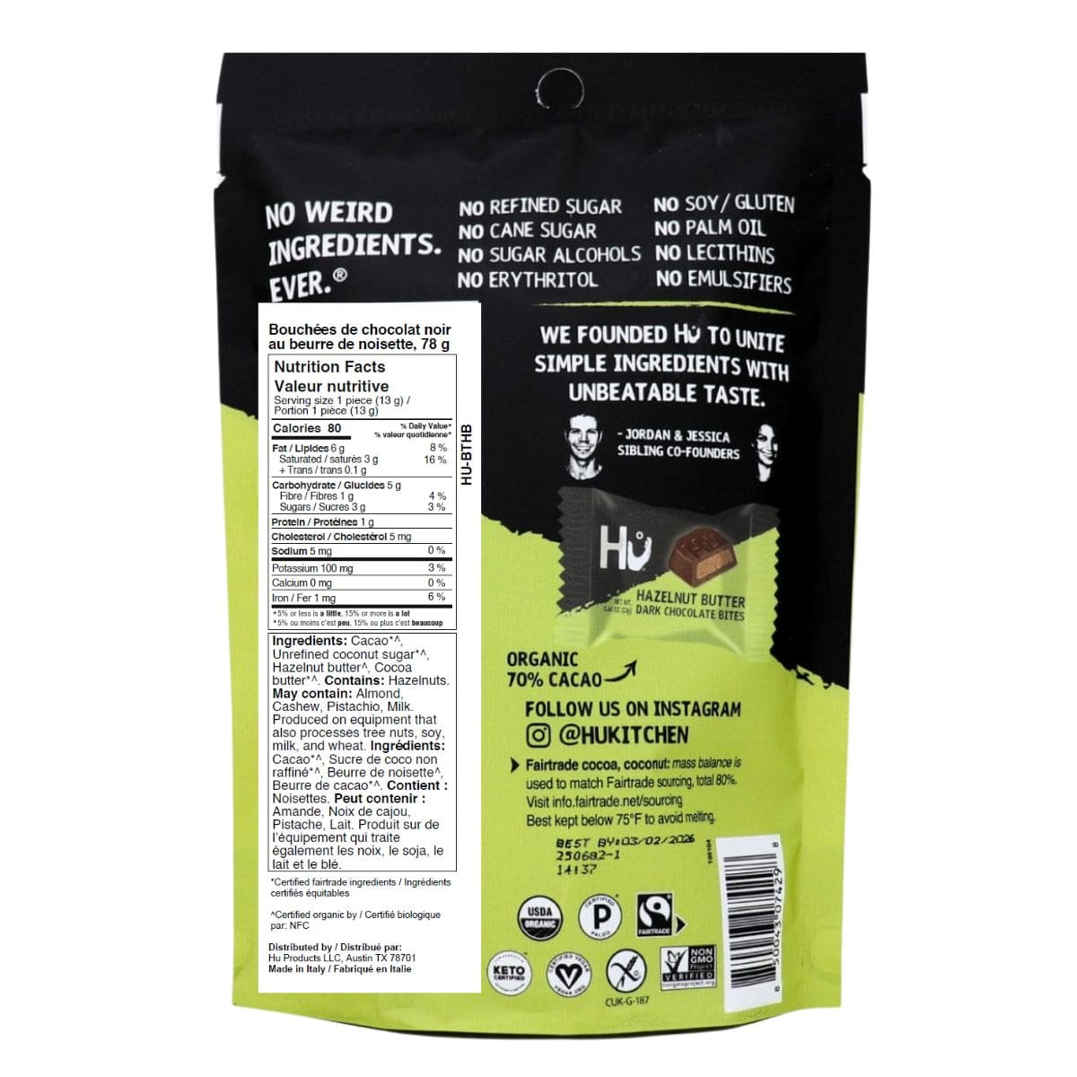 Nut your average chocolate. Hu Kitchen’s Hazelnut Butter Dark Chocolate Bites uses fairtrade and organic dark chocolate and filled it with a luscious hazelnut butter for one heavenly bite. Made wih just four simple ingredients Hu Chocolates are the gold standard of clean snacking. Free from refined sugar, palm oil, emulsifiers, and weird additives, this hazelnut buttter chocolate is certified paleo, vegan, keto, and gluten-free. From afternoon pick-me-ups to midnight sneaks, Hu Kitchen is always a good idea.