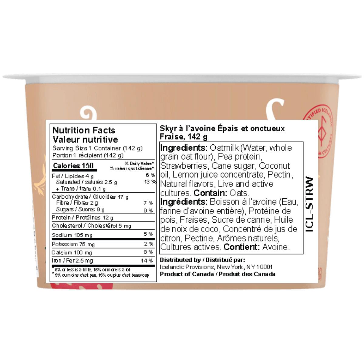 Oatmilk (Water, whole grain oat flour), Pea protein, Strawberries, Cane sugar, Coconut oil, Lemon juice concentrate, Pectin, Natural flavors, Live and active cultures.