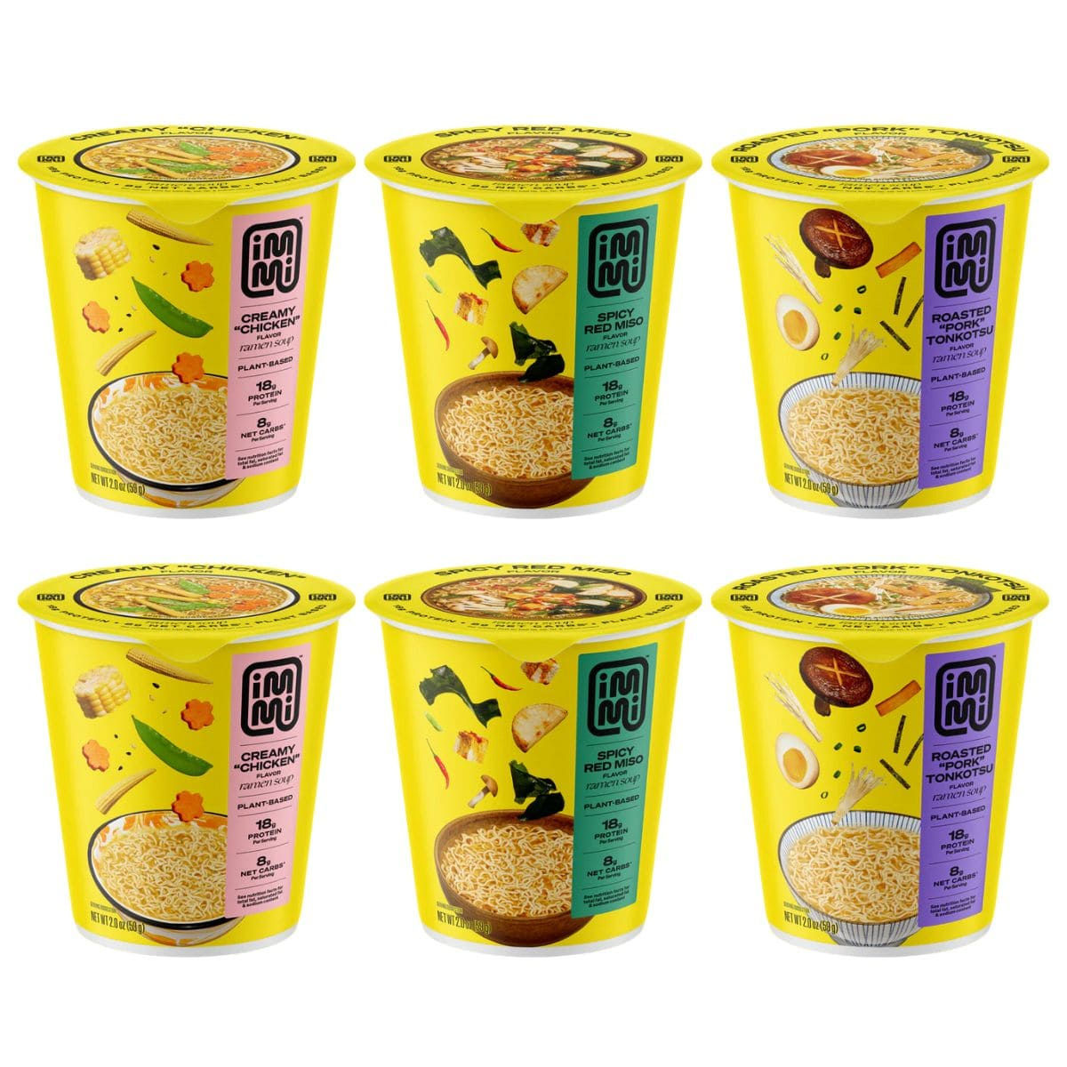 6 individual ramen cups of Immi Keto High Protein Ramen, 59 g each, 6 cups total: 2x Spicy Red Miso 59 g, 2x Roasted “Pork” Tonkotsu 59 g, 2x Creamy “Chicken” 59 g.