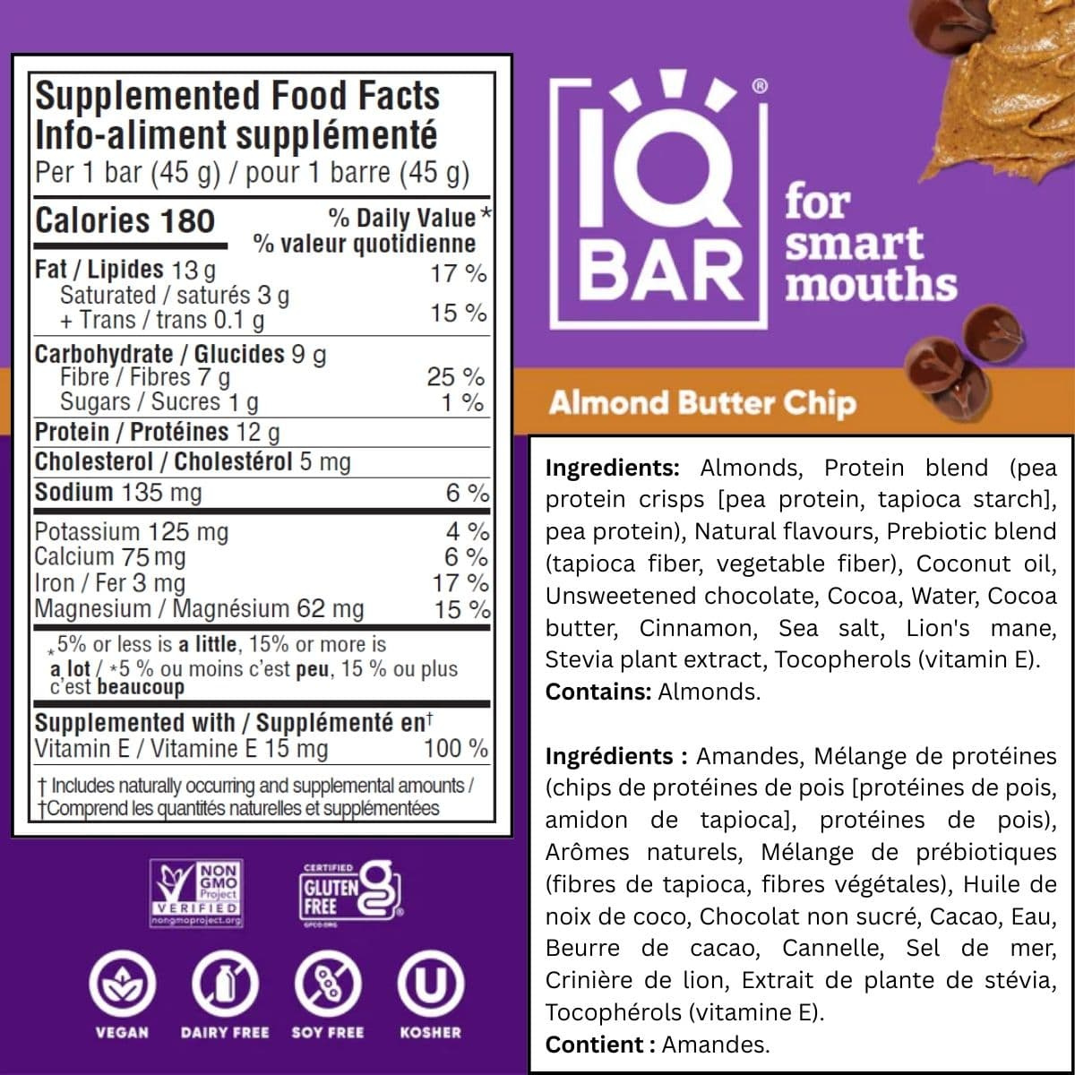 What’s inside the IQ Bar Almond Butter Chip is even better: With 12 grams of plant protein, 7 grams of fiber and only 1 gram of sugar per 12 bar serving, you ‘ll feel great about grabbing one for breakfast, post workout, or just whenever a craving hits. With great taste and great nutrition, it’s the energy bar that ticks all the boxes!