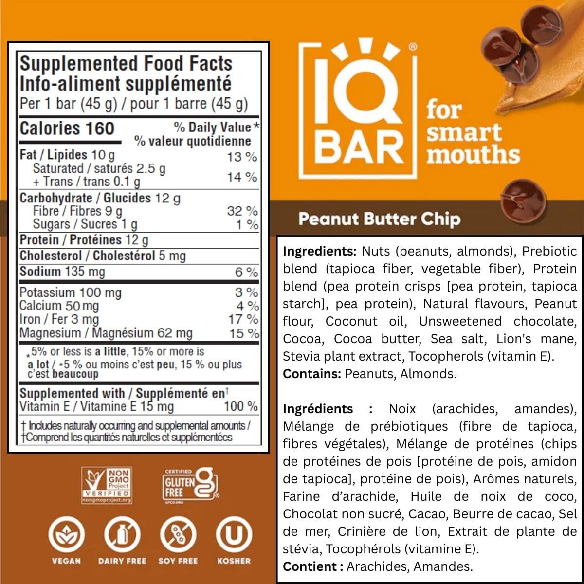 What is it about peanut butter and chocolate that makes us go a little, well, nutty? Whatever it is, you’ll find it in the IQ Bar Peanut Butter Chip energy bar. It’s a delicious fusion of slightly savoury peanuts and real, rich, dark chocolate chips, that tastes like a satisfying cookie treat.