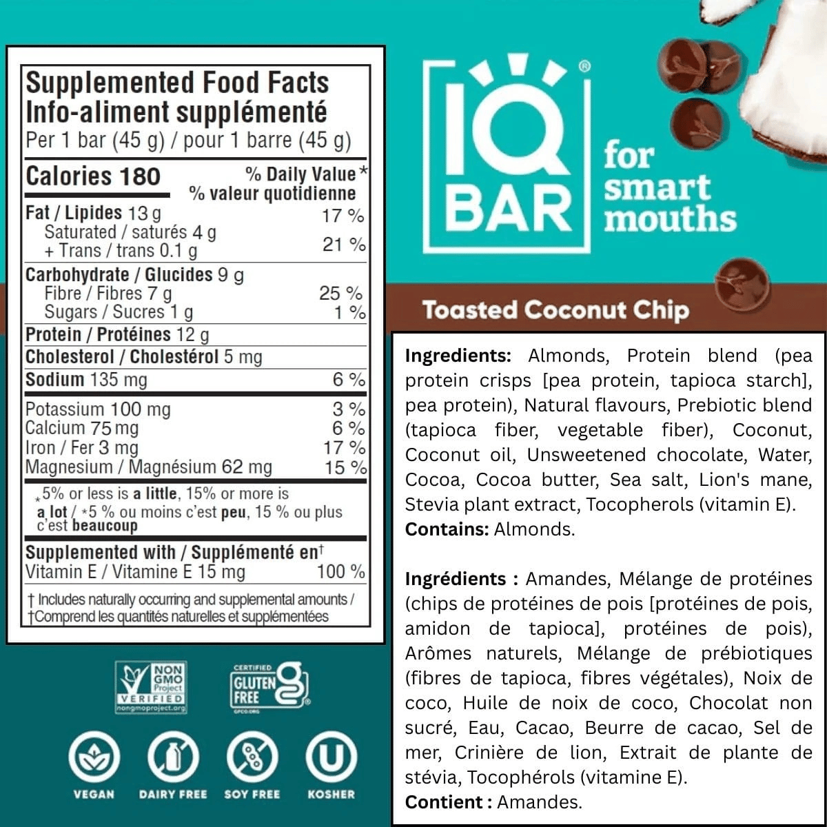 IQ Bar Toasted Coconut Chip, 45 g - Almonds, Protein Blend (Pea Protein Crisps [Pea Protein, Tapioca Starch], Pea Protein), Natural Flavors, Prebiotic Blend (Tapioca Fiber, Vegetable Fiber), Coconut, Coconut Oil, Unsweetened Chocolate, Water, Cocoa, Cocoa Butter, Sea Salt, Lion's Mane, Stevia Plant Extract, Tocopherols (vitamin E)