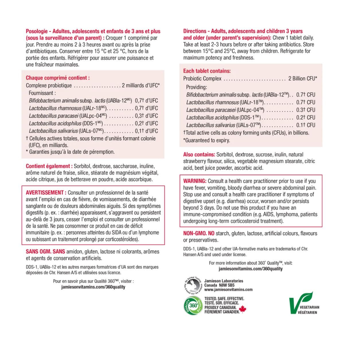 Want to start taking probiotics but hate hard-to-swallow pills? Well, have we got just what you need. Jamieson Vitamins Chewable Probiotic Natural Strawberry Yogurt is easy-to-take non-GMO and gluten-free probiotic that supports the healthy function of your digestive system. They are suitable for adults or children (ages 3 and up). Guaranteed potency, freshness, and active cells in each tablet. In a wonderful strawberry yogurt flavour that makes taking this probiotic berry, berry simple. A tasty daily supplement that supports your digestive system? What a dream! It has never been more effortless than it is right now to kickstart your health journey. It all starts here, with Jamieson.
