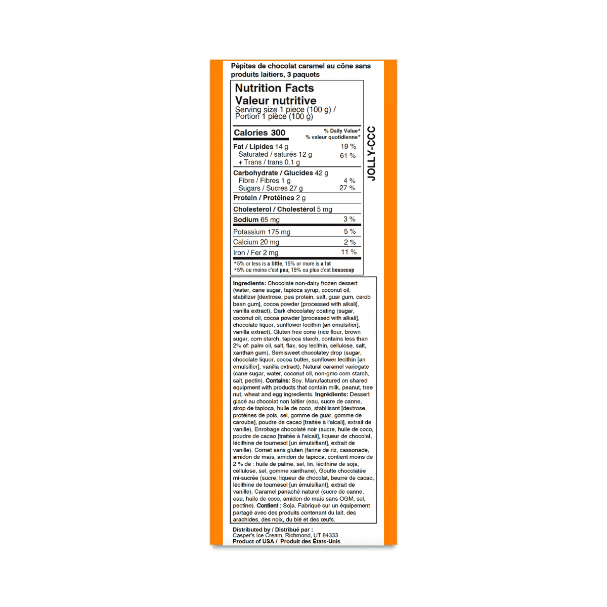 Non-Dairy Frozen Dessert (Water, Stabilizer (Tapioca Syrup Solids, Dextrose, Pea Protein, Salt, Locust Bean Gum, Guar Gum), Cane Sugar, Coconut Oil, Cocoa Processed With Alkali, Natural Flavor), Gluten Free Cone (Rice Flour, Brown Sugar, Corn Starch, Tapioca Starch, Cellulose, Natural Flavor, Salt, Soy Lecithin, Vegetable Oil Shortening (May Contain One Or More Of The Following: Canola Oil, Coconut Oil, Modified Palm Oil, Soybean Oil, And Soy Lecithin), Xanthan Gum), Chocolate Flavored Coating (Sugar, Coconut Oil, Cocoa Powder (Processed With Alkali) Chocolate Liquor, Sunflower Lecithin (An Emulsifier), Vanilla Extract), Chocolate Drop (Sugar, Chocolate Liquor, Cocoa Butter, Sunflower Lecithin (An Emulsifier), Vanilla Extract), Caramel Variegate (Cane Sugar, Water, Coconut Oil, Non-GMO Corn Starch, Salt, Pectin).