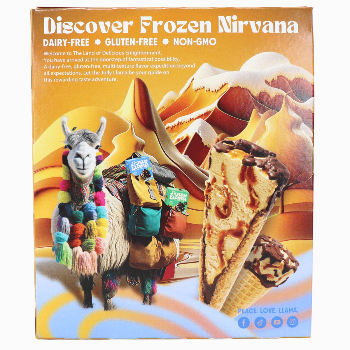 Experience the perfect harmony of sweet and salty with Jolly Llama's Dairy-Free Sea Salt Caramel Cones. Each cone features a luscious caramel-flavored non-dairy frozen dessert, swirled with rich caramel variegate and topped with a chocolatey drizzle. Encased in a crisp, gluten-free waffle cone, this treat delivers indulgence without compromise.