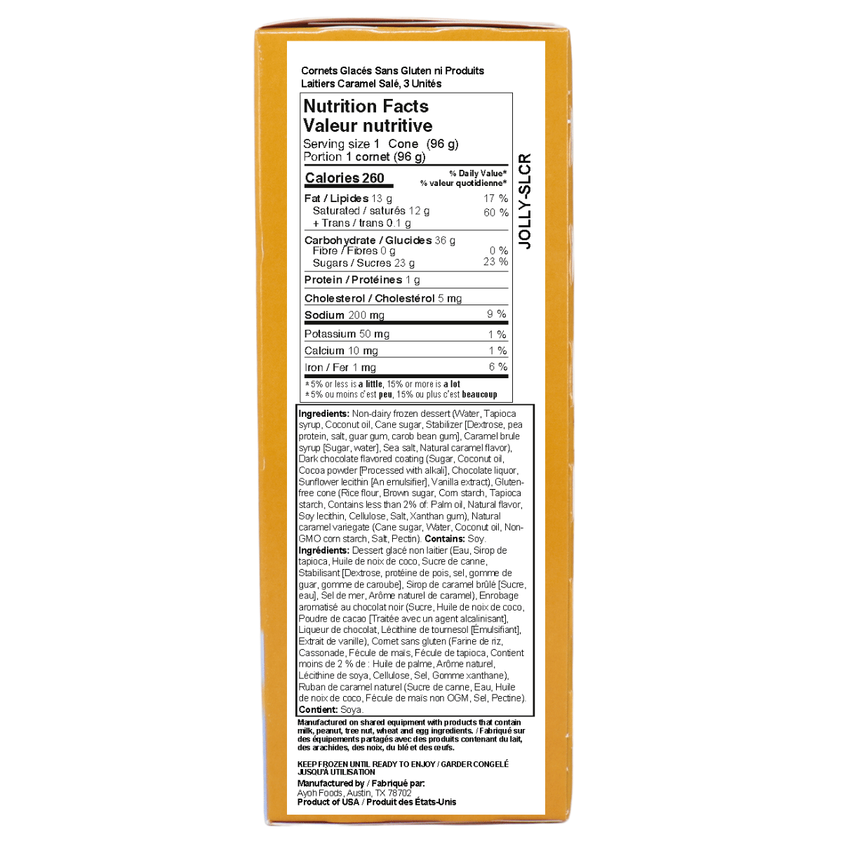 Non-dairy frozen dessert (Water, Tapioca syrup, Coconut oil, Cane sugar, Stabilizer [Dextrose, pea protein, salt, guar gum, carob bean gum], Caramel brule syrup [Sugar, water], Sea salt, Natural caramel flavor), Dark chocolate flavored coating (Sugar, Coconut oil, Cocoa powder [Processed with alkali], Chocolate liquor, Sunflower lecithin [An emulsifier], Vanilla extract), Gluten-free cone (Rice flour, Brown sugar, Corn starch, Tapioca starch, Contains less than 2% of: Palm oil, Natural flavor, Soy lecithin, Cellulose, Salt, Xanthan gum), Natural caramel variegate (Cane sugar, Water, Coconut oil, Non-GMO corn starch, Salt, Pectin).