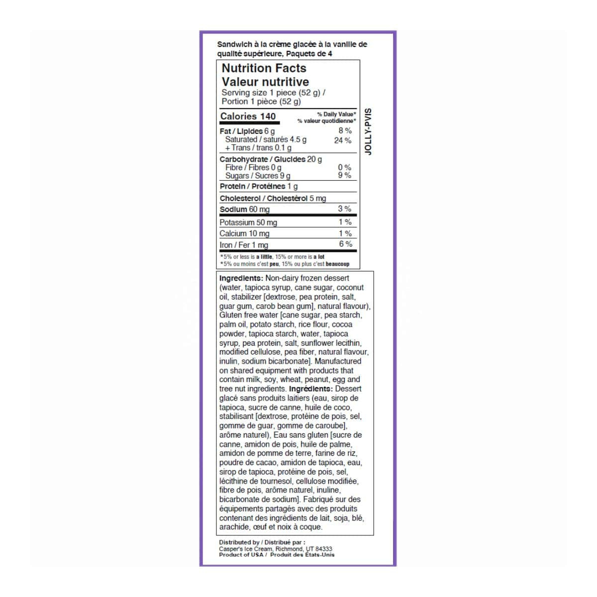 Non-Dairy Frozen Dessert (Water, Tapioca Syrup, Cane Sugar, Coconut Oil, Stabilizer [Dextrose, Pea Protein, Salt, Guar Gum, Carob Bean Gum], Natural Flavour), Gluten Free Water [Cane Sugar, Pea Starch, Palm Oil, Potato Starch, Rice Flour, Cocoa Powder, Tapioca Starch, Water, Tapioca Syrup, Pea Protein, Salt, Sunflower Lecithin, Modified Cellulose, Pea Fiber, Natural Flavour, Inulin, Sodium Bicarbonate].