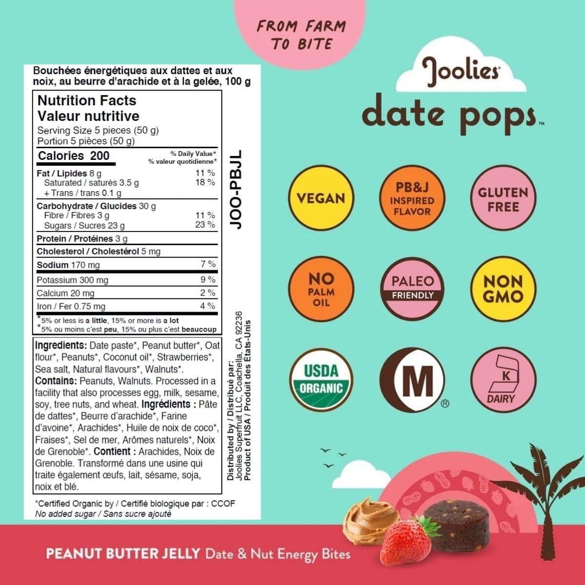 Who says PB&J is just for sandwiches? Joolies Peanut Butter Jelly Date Pops take the best of this childhood favourite and turn it into a soft, chewy date energy bite that's packed with delicious goodness. Made with organic medjool dates, crunchy walnuts, creamy peanut butter and sweet strawberries, these date bites deliver the perfect balance of sweet and nutty goodness. With no added sugar and only simple organic ingredients, Joolies' peanut butter and jelly energy balls are a snack you can feel good about popping any time of day. It's peanut butter jelly time!