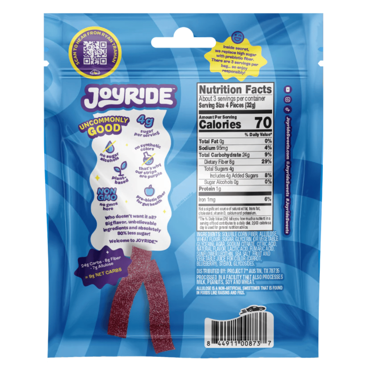 With a handy 2 pack, you can double down on lower sugar blue raspberry candy strip goodness. Joyride Sour Blue Raspberry Strips are stretchy, chewy, and made for plant-based sour candy snackers who want more blue raspberry flavoured candy with less sugar.